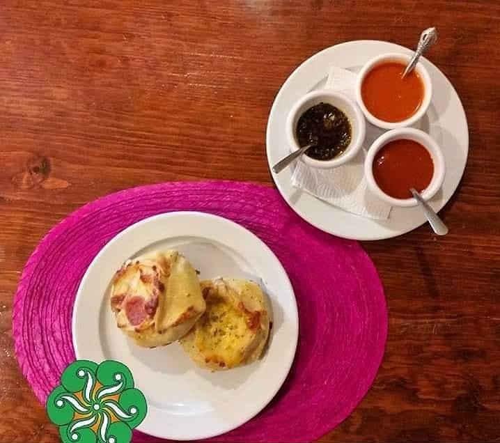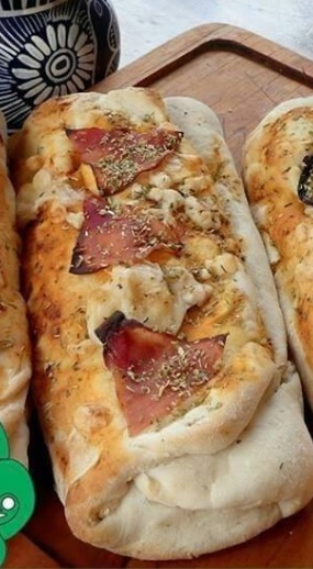 Con panela, aceitunas, salsa de tomate, queso y pesto con parmesano.