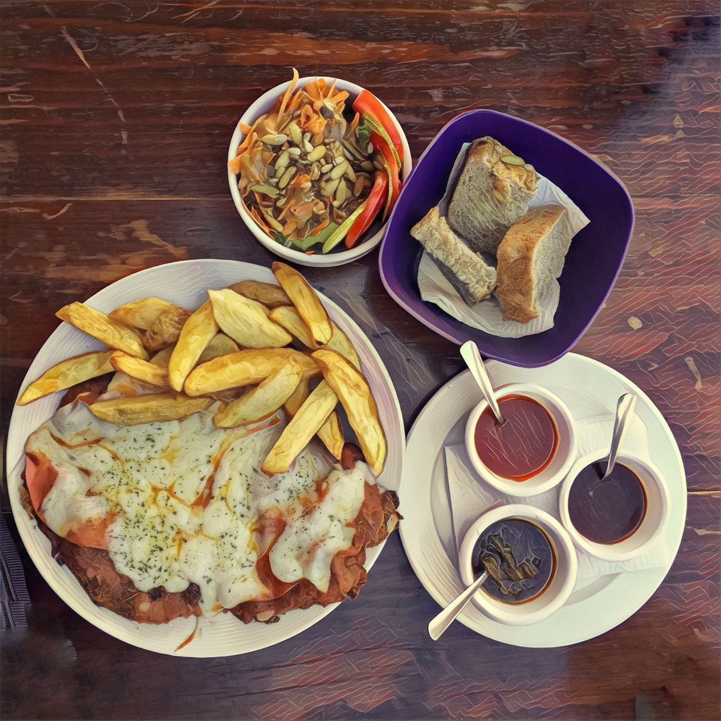 Queso, jamón de pavo, salami, pepperoni, cebollas, tomate, orégano y aceite de oliva con mezcla de cuatro quesos.
