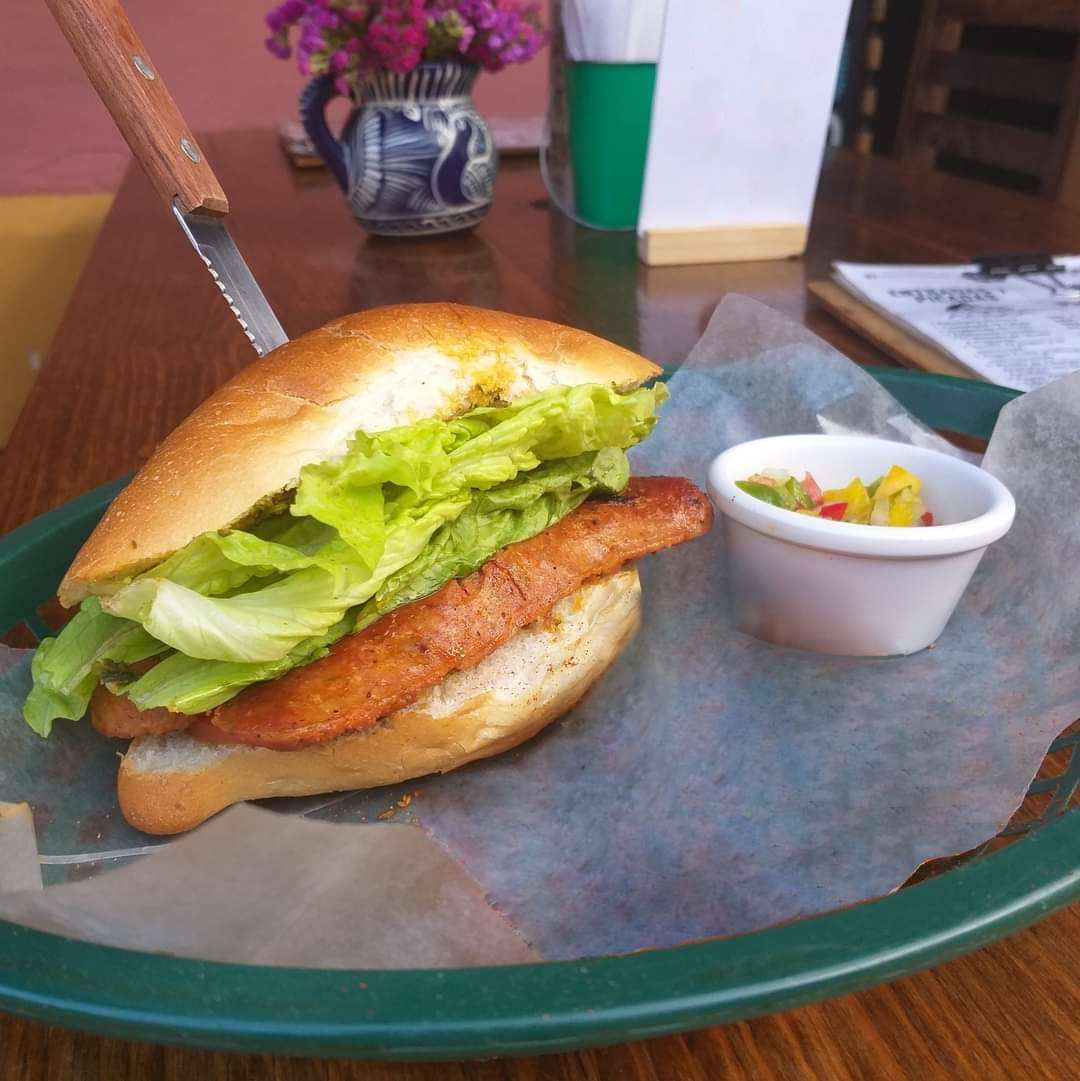 Con lentejas, quínoa, champiñones, cebolla, quesos, lechuga, tomates y mayochimi en pan de Bagel.