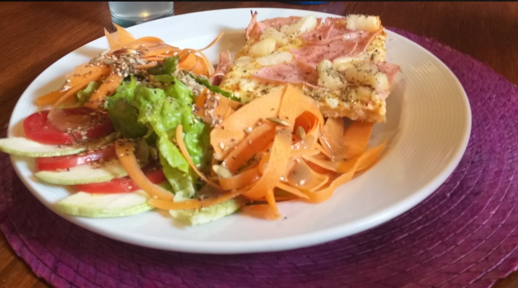 Pisto de berenjena queso, tomate, zanahoria y semillas tostadas.