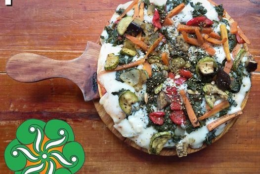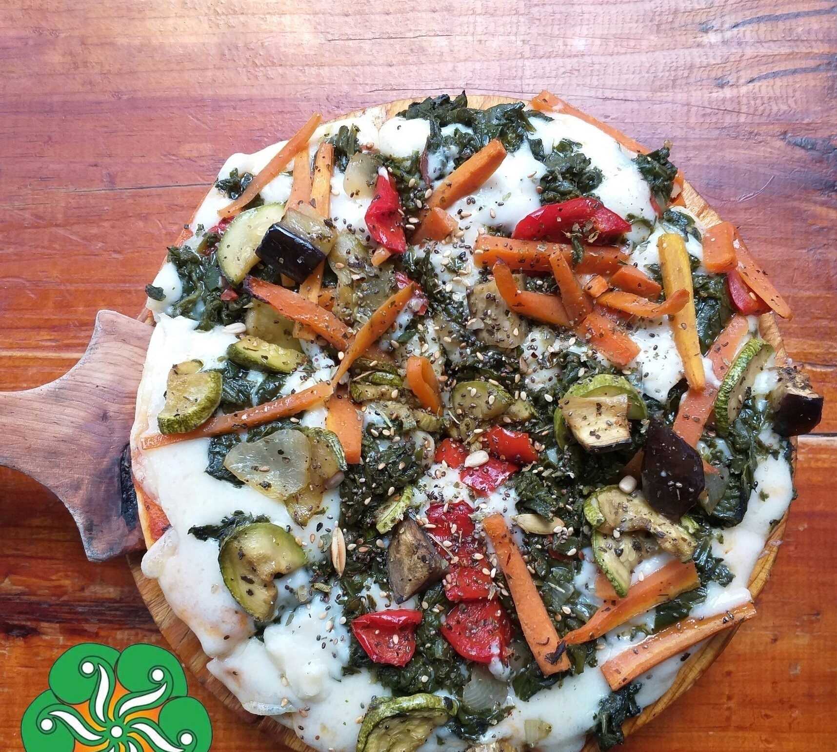 Ingredientes: salsa de tomate, brócoli, queso mozzarella, cebolla, zanahoria, berenjenas y pimiento morrón.