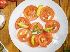 Tomate, mozzarella, jamón serrano, queso burrata.