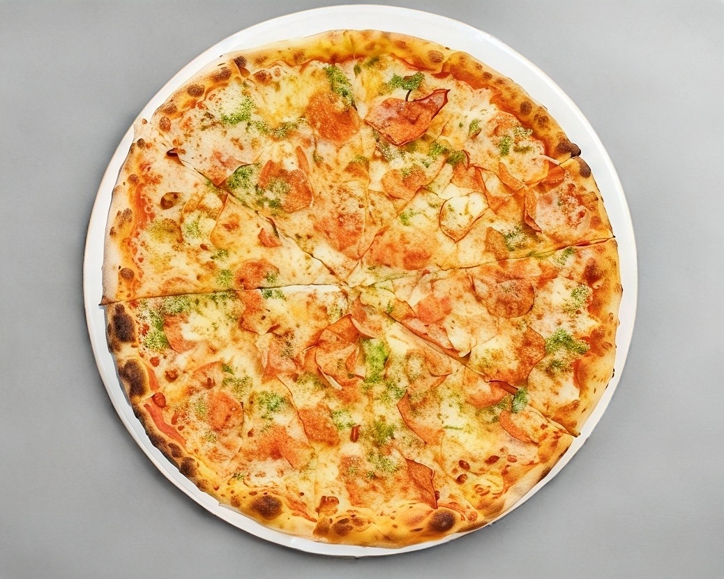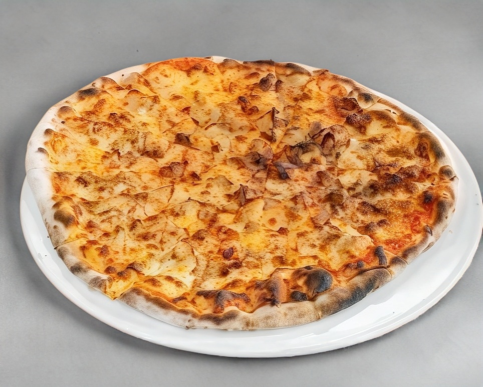 Tomate, mozzarella, chicharrón de hebra y salsa roja.