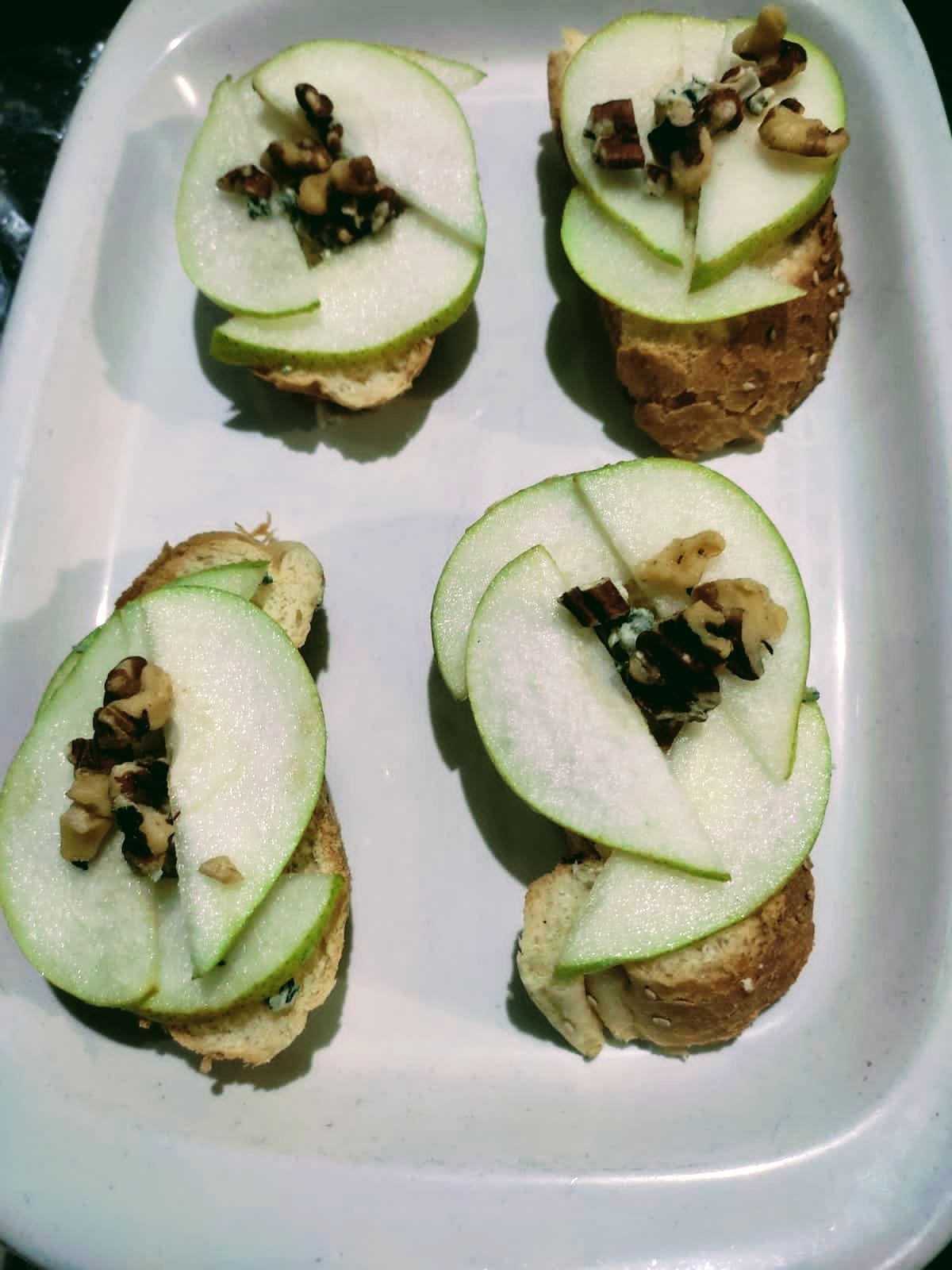 Manzanas, pasos, nuez garapiñada y queso azul.