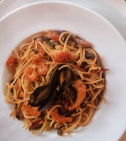 Mezcla de frutos del mar, pimientos, cebollín y jitomate.