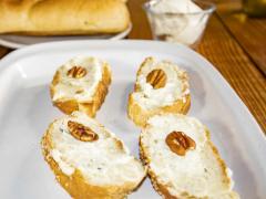 Pan tostado con nuez, queso de cabra fundido y tomate seco.