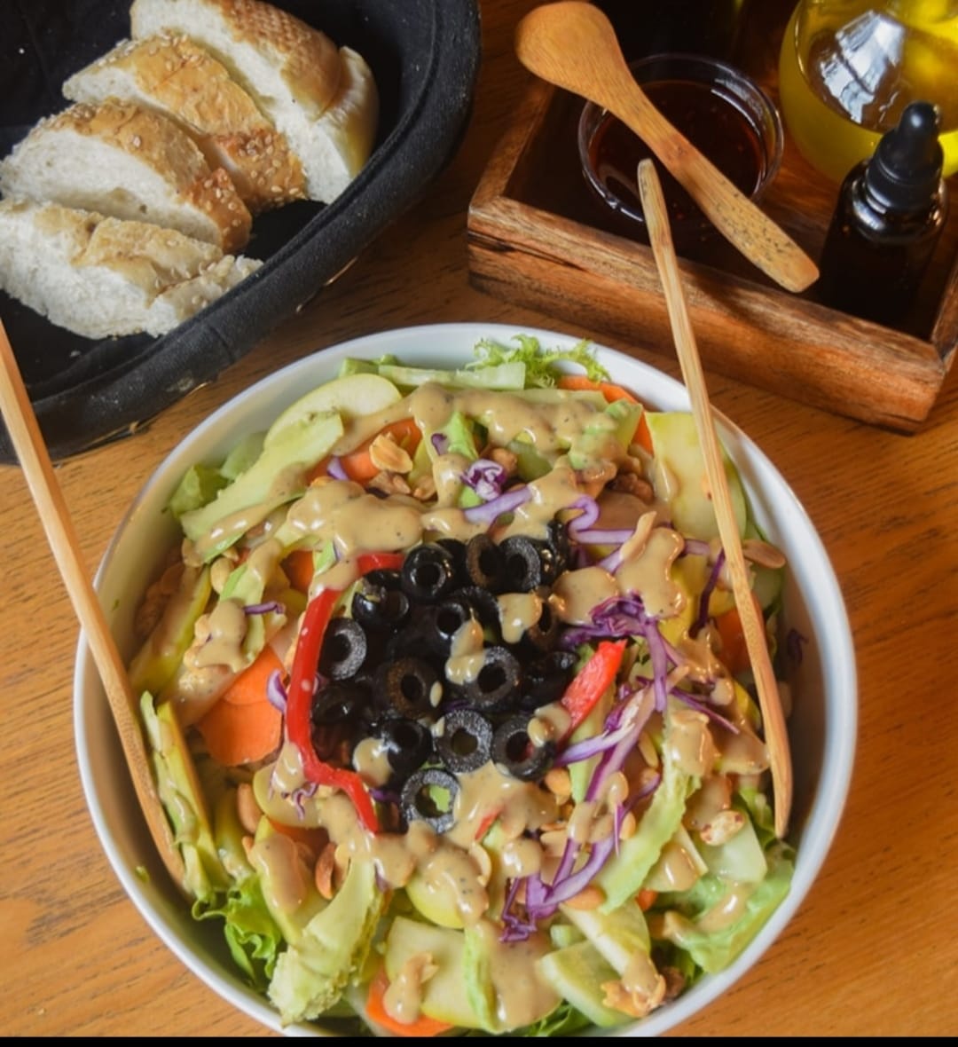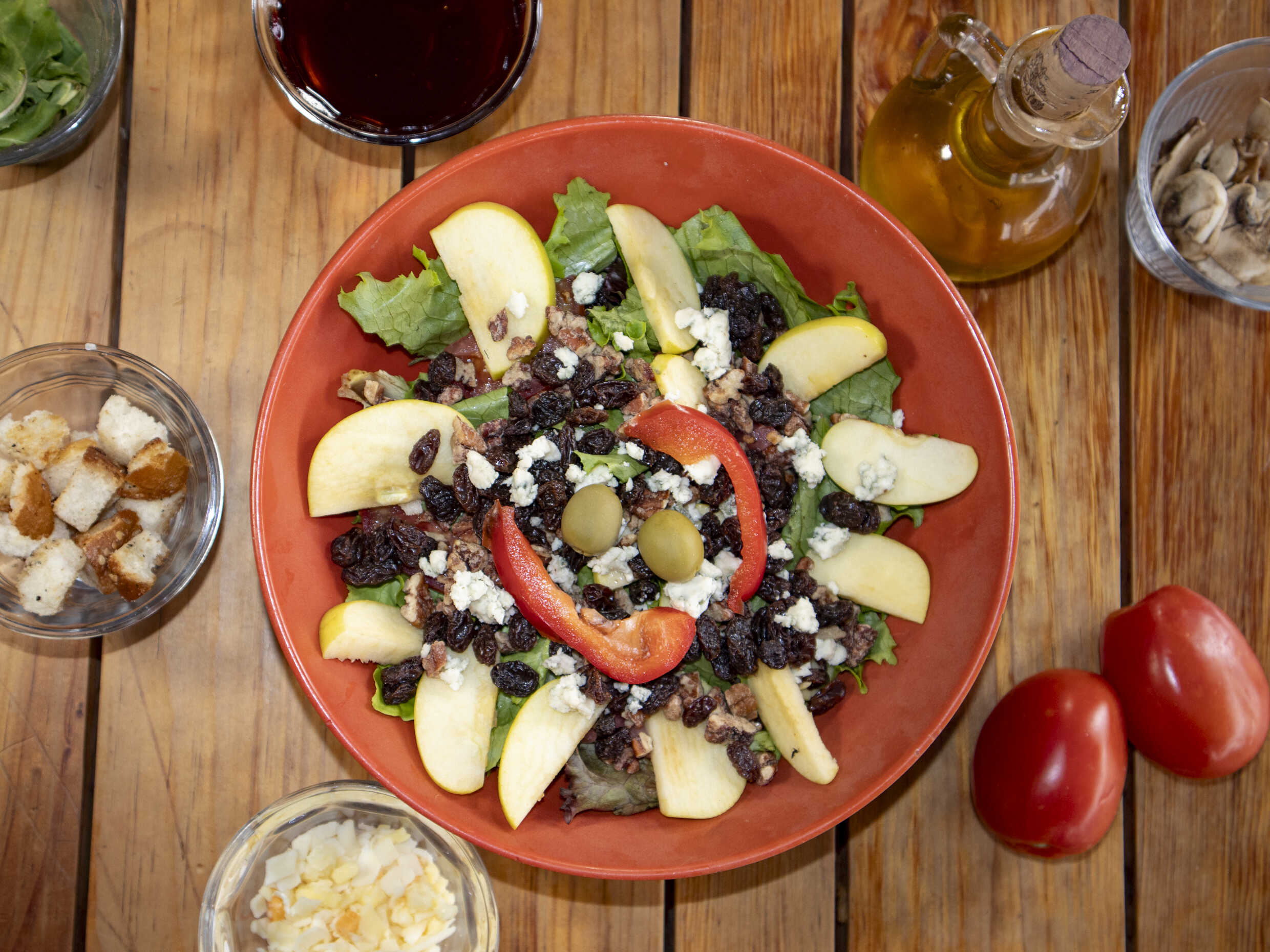 Pollo, nuez, queso gouda, manzana, aceitunas y queso de cabra.
