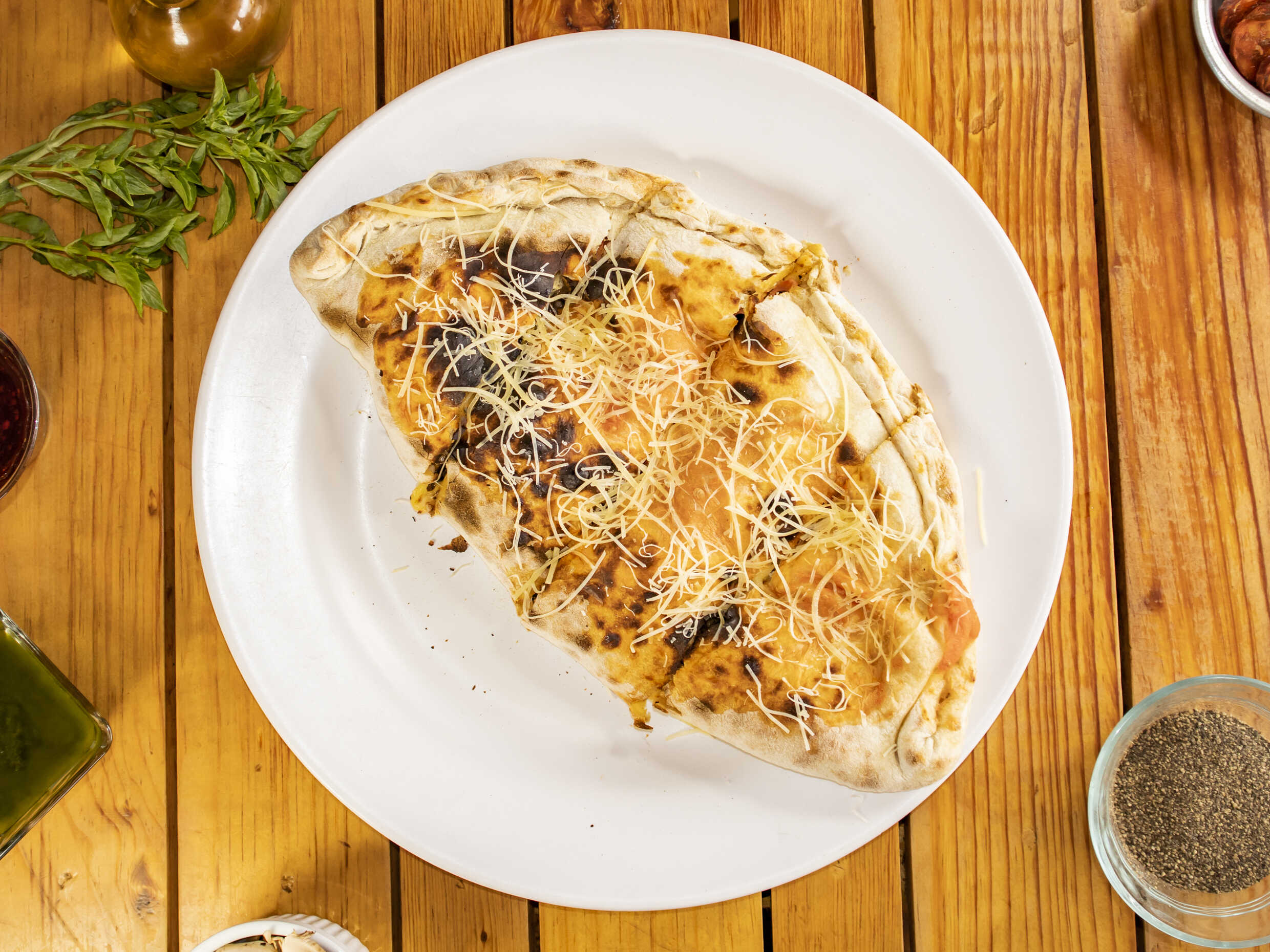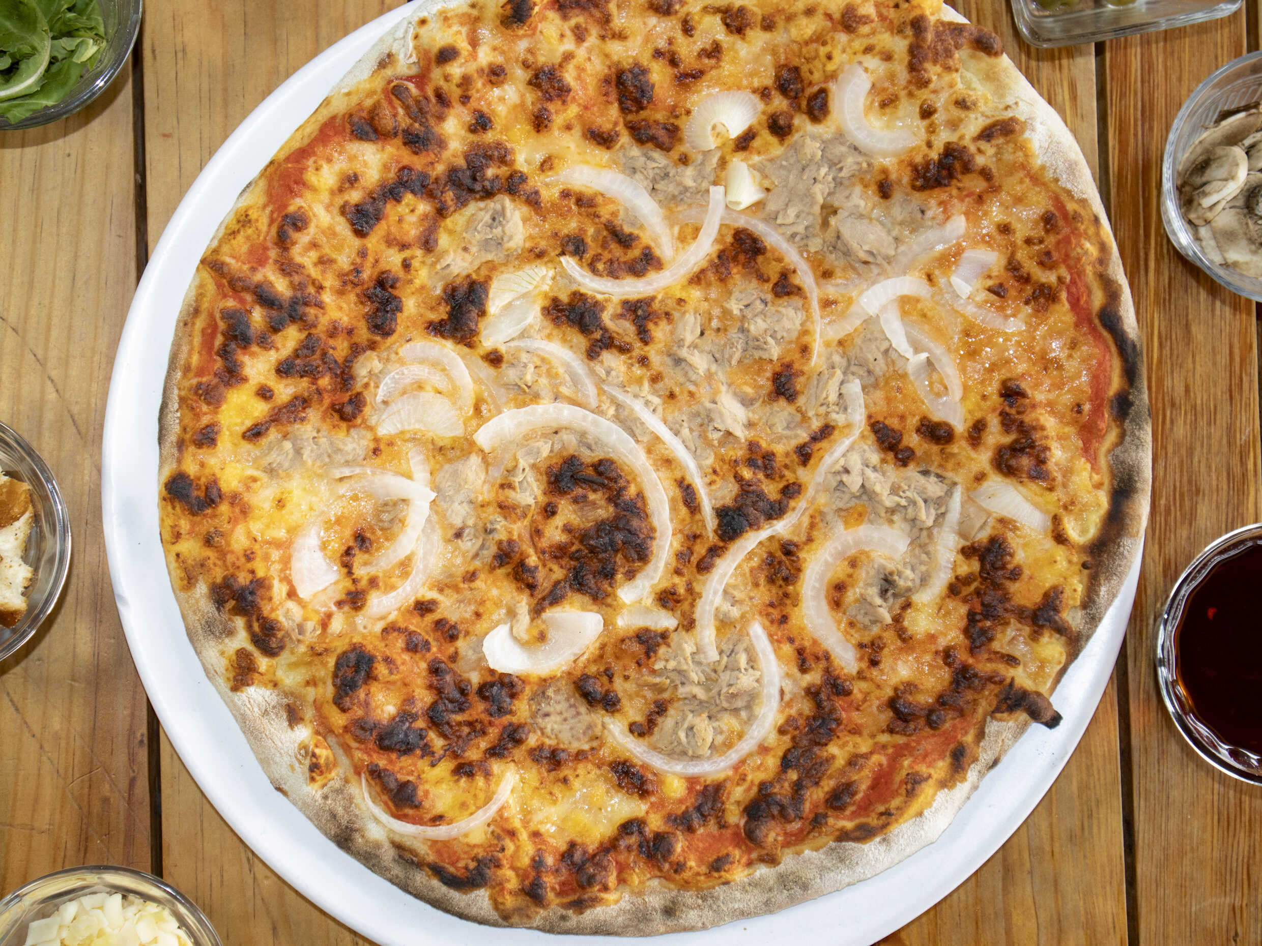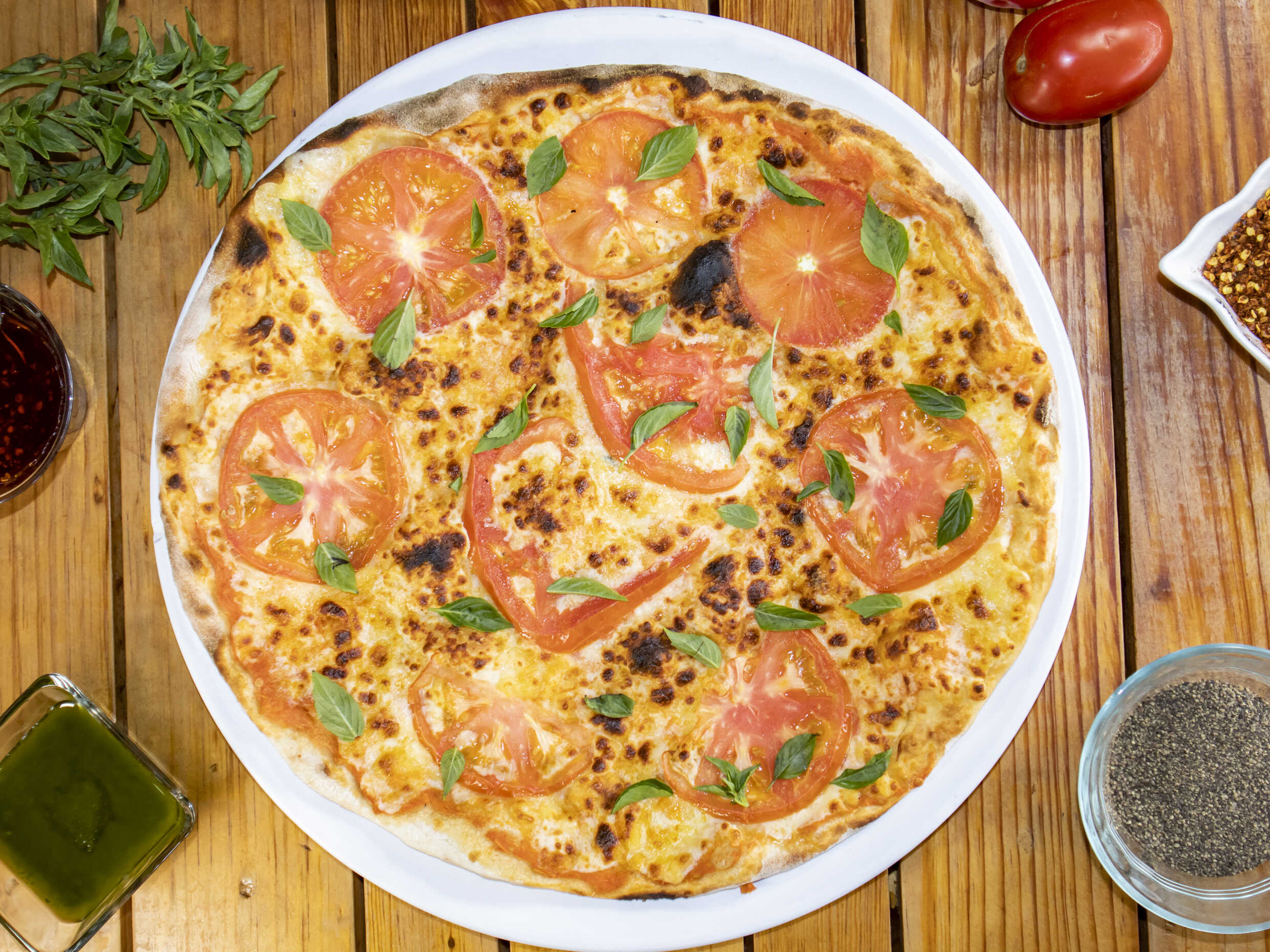 Tomate, mozzarella, aceitunas, anchoas, alcaparras.