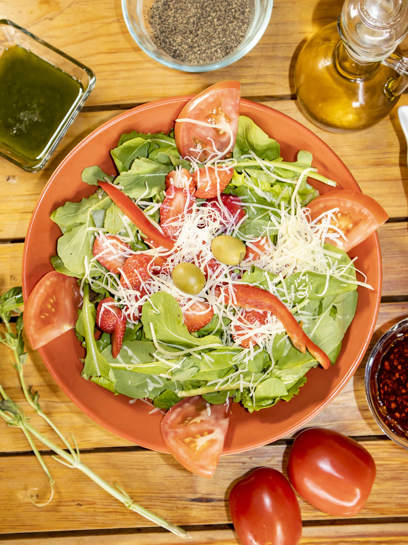 Rúcula, cacahuates, fresas, queso parmesano y camote.