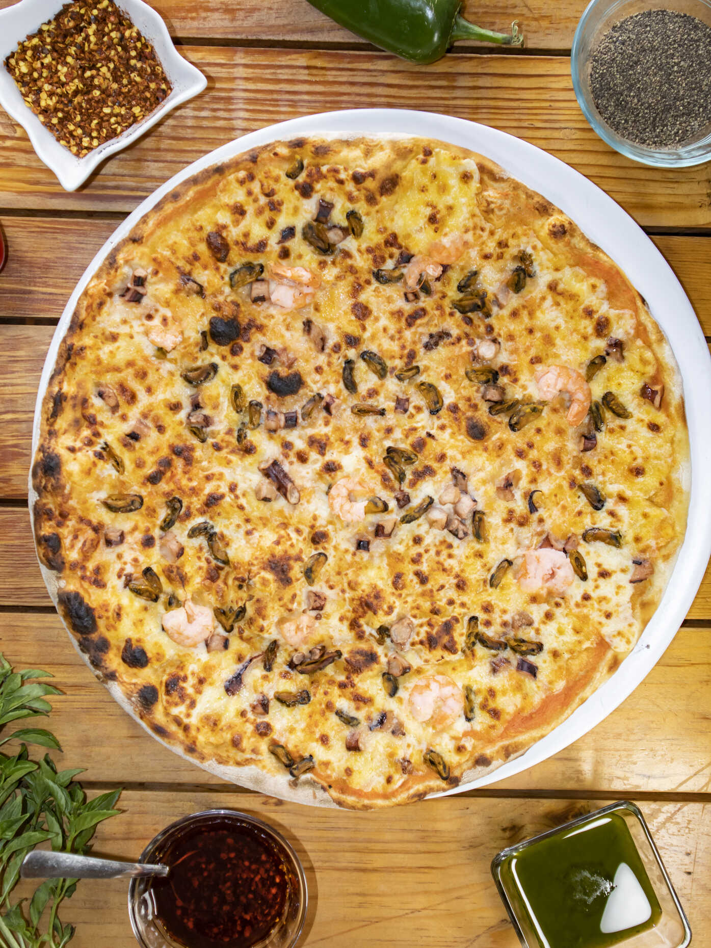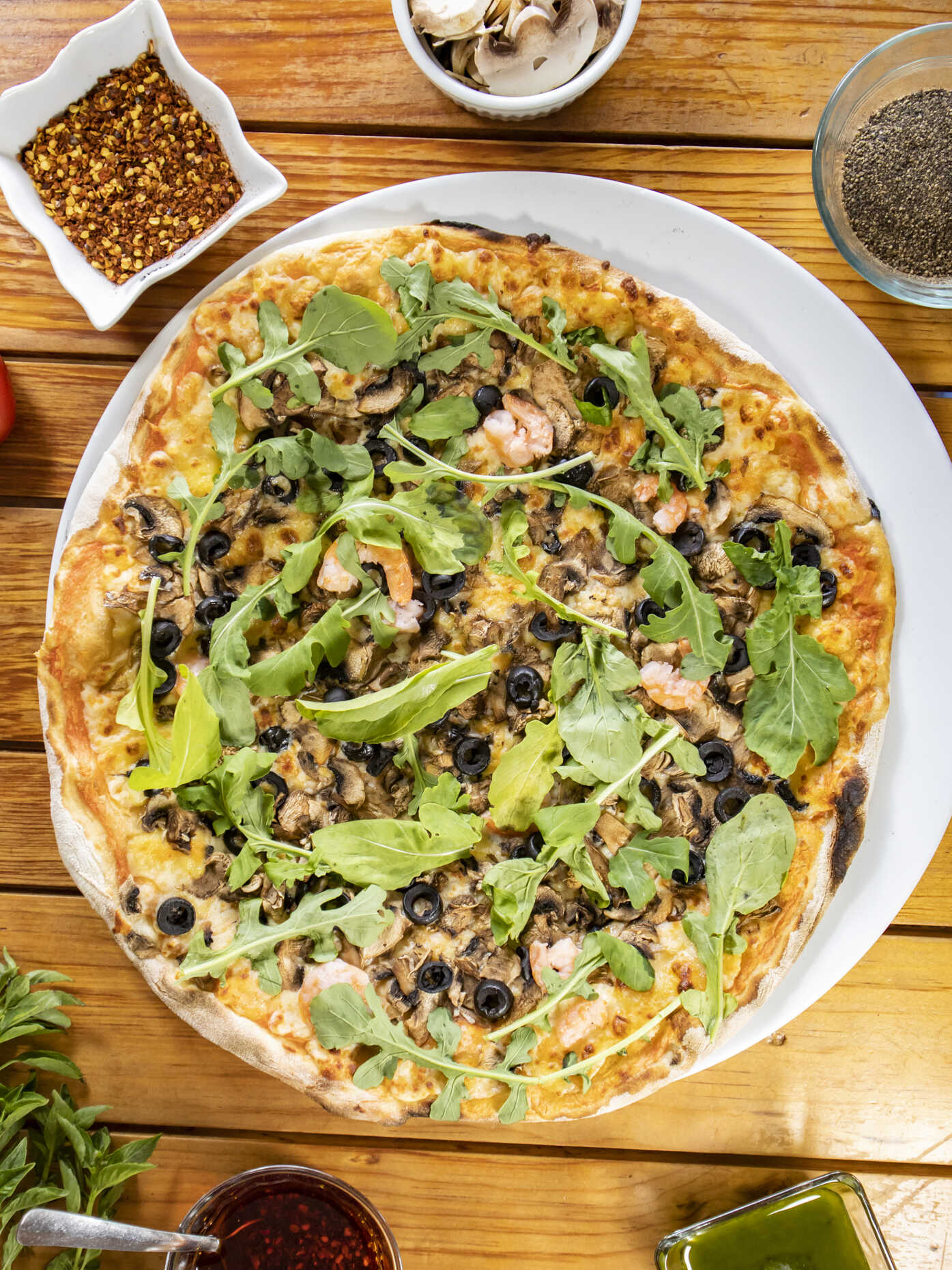 Tomate, mozzarella, aceitunas, champiñones, camarones y rúcula.