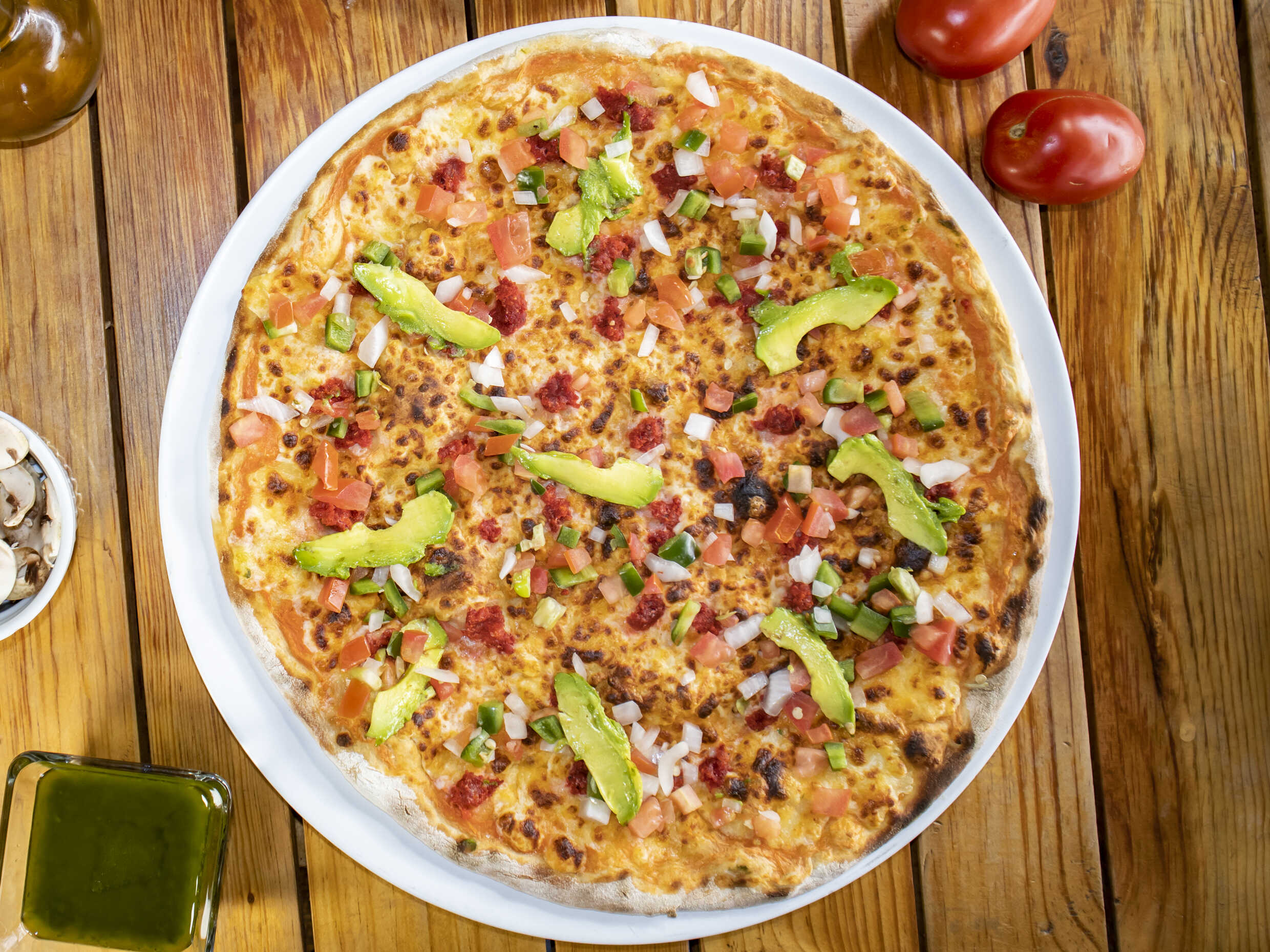 Tomate, mozzarella, chorizo jalapeños, aguacate y pico de gallo.