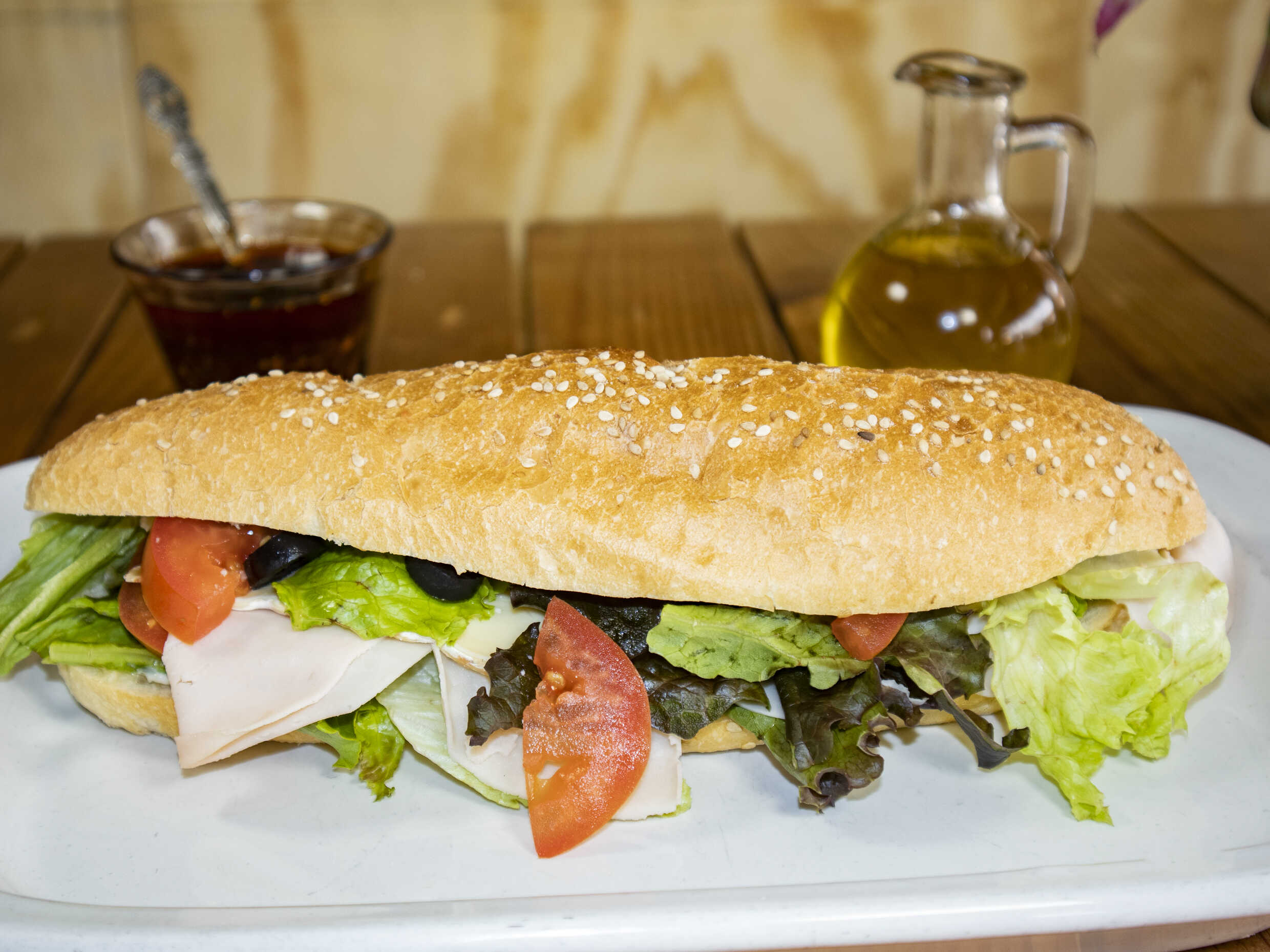 Jamón de pechuga de pavo, queso brie, lechuga, tomate y aceitunas negras.