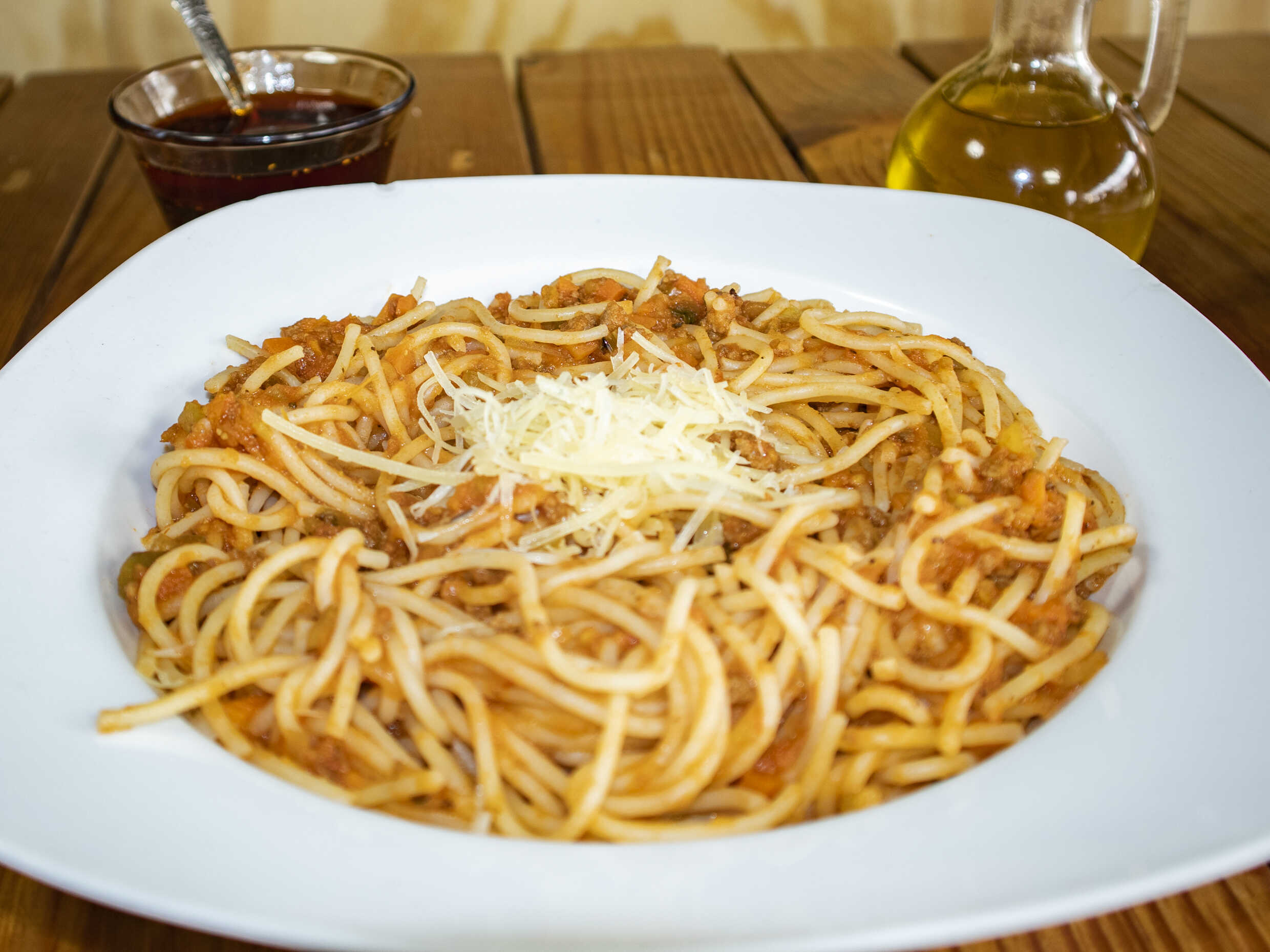 Mozzarella, tomate, pistache, mortadella y albahaca.