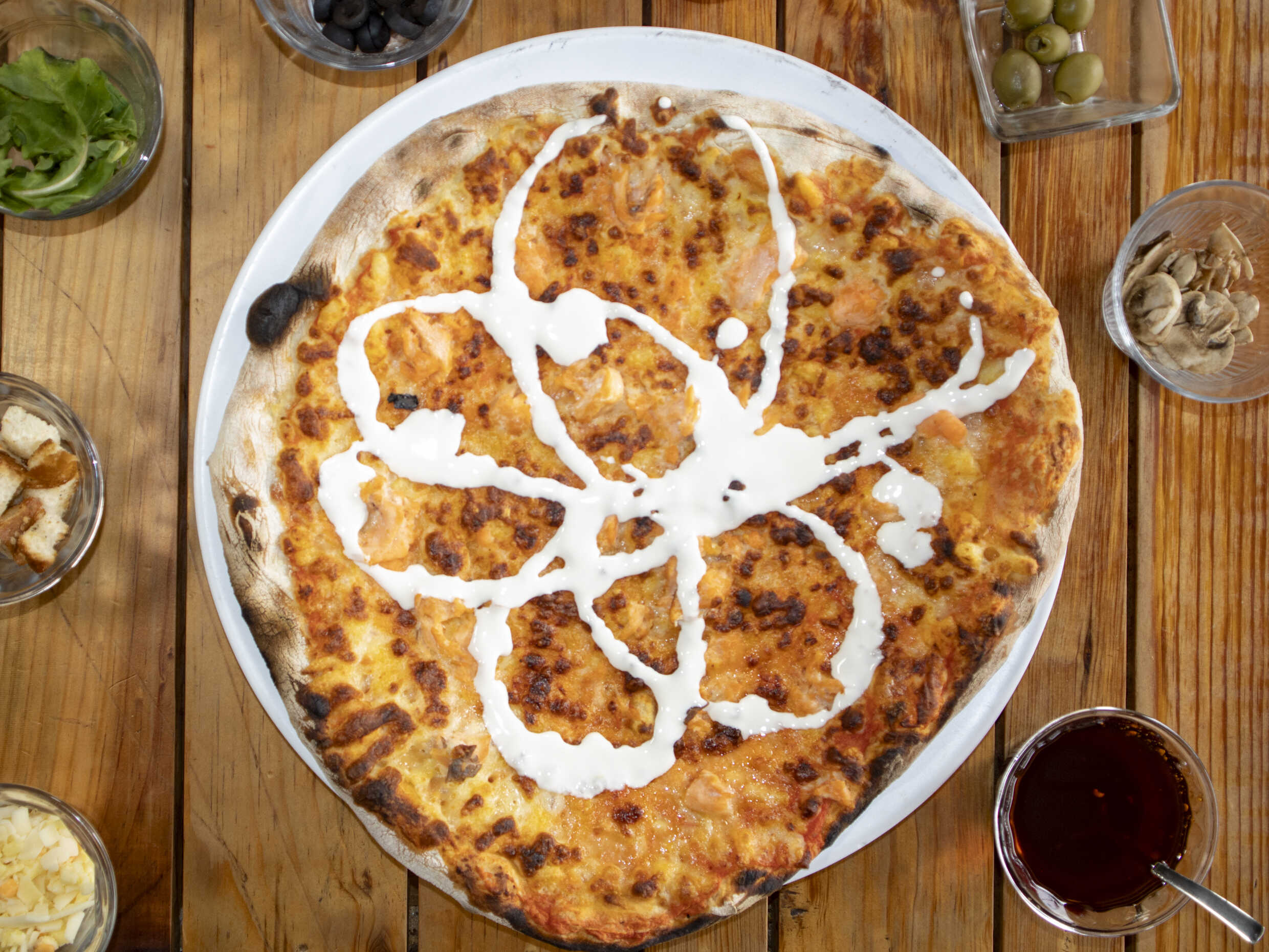 Tomate, mozzarella, jamón de pierna, alcachofa, orégano.