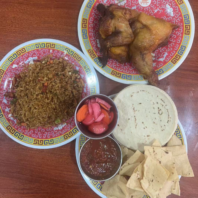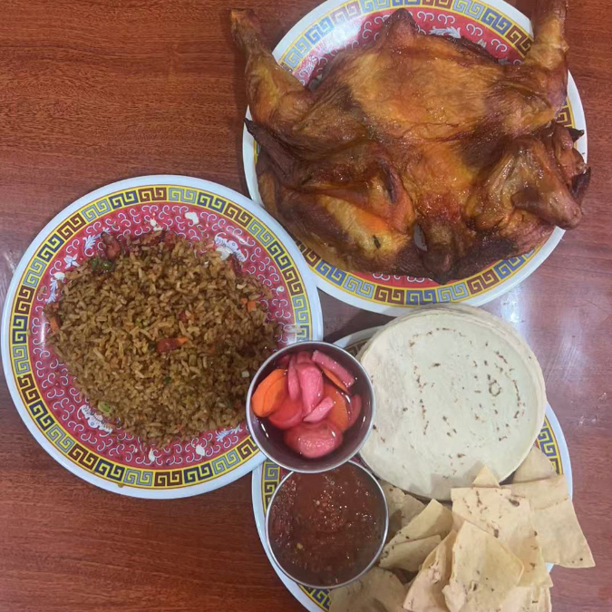 2 pollos Incluye arroz, tortilla, tostadas y salsa.