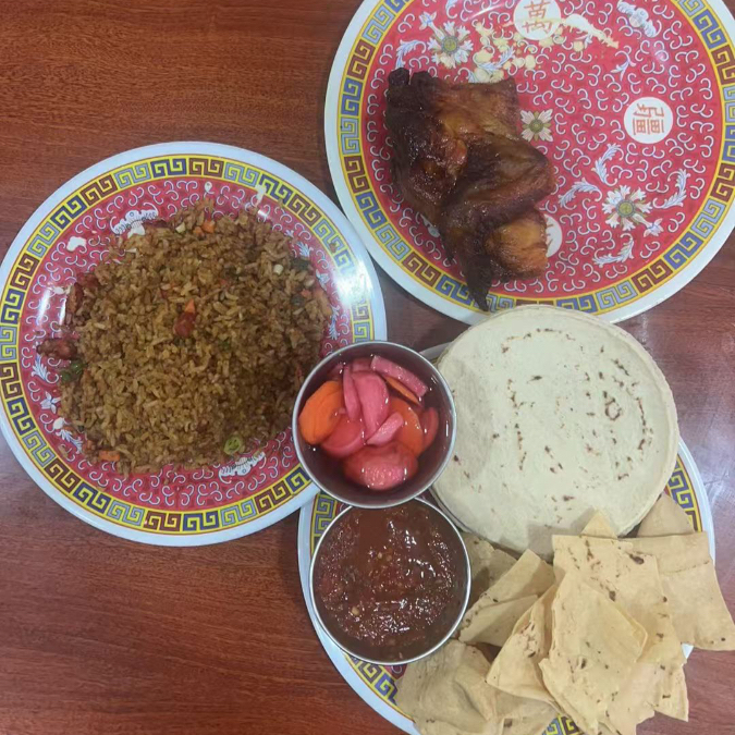 Incluye arroz, tortilla, tostadas y salsa.