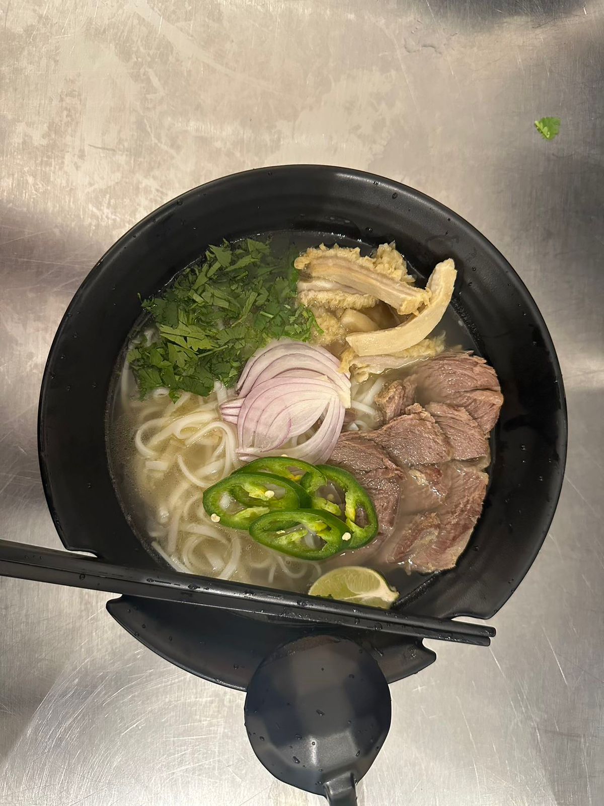 Pho con pollo, pollo asado con hueso, 2 rollos primavera, ensalada de verdura más 1 L horchata.