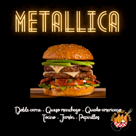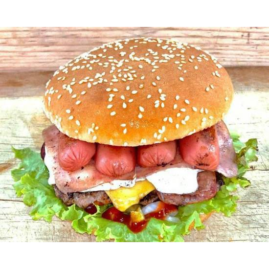 Doble carne, pepinillos, jamón, tocino, queso americano y queso manchego.