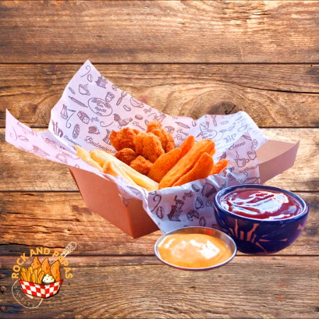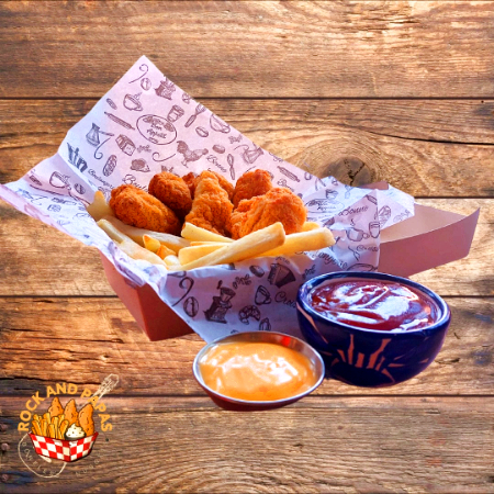 Papas a la francesa 150 gr, papas gajo 150 gr, boneless 100 gr, nuggets 50 gr, tenders 100 gr y 2 refrescos de 400 ml.