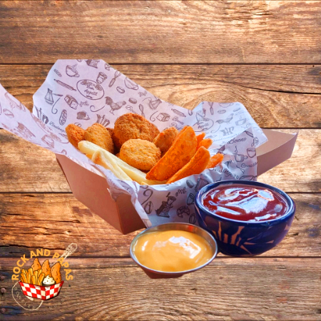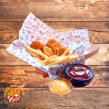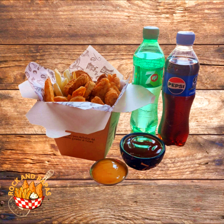 Papas a la francesa 200 gr, nuggets 150 gr y 1 refresco de 400 ml.
