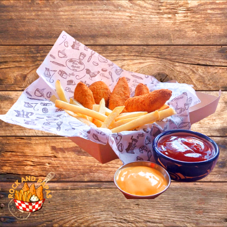 Papas a la francesa 200 gr, tenders 160 gr y 1 refresco de 400 ml.