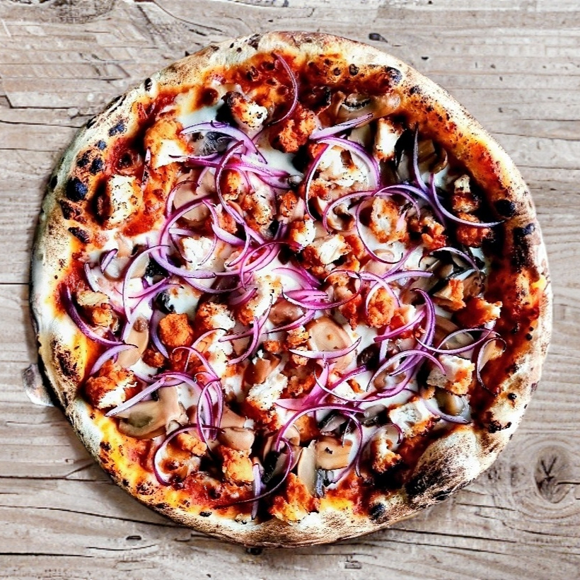 Boneless de pechuga de pollo, champiñones, cebolla morada, queso mozzarella y salsa pomodoro. Incluye chimichurri, salsa macha (chili oil) y salsa cátsup. 8 rebanadas, 32 cm.