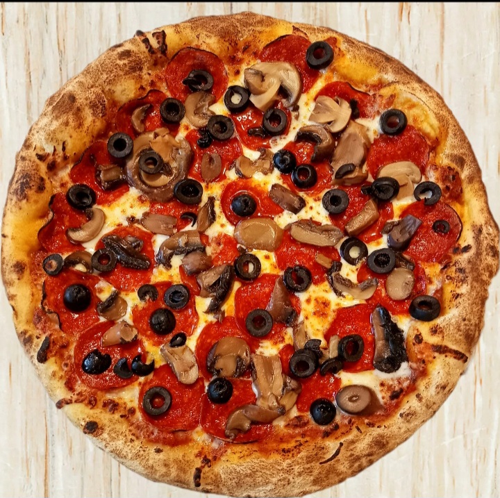 Pepperoni, aceitunas negras, champiñones, salsa pomodoro y queso mozzarella. Incluye chimichurri, salsa macha (chili oil) y salsa cátsup, 8 rebanadas 32 cm.