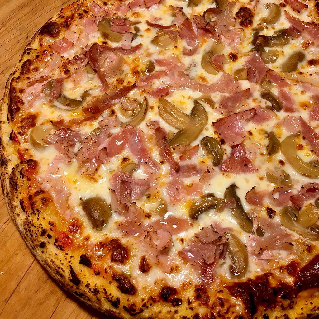 Tocino ahumado, champiñones, salsa pomodoro y queso mozzarella. Incluye chimichurri, salsa macha (chili oil) y salsa cátsup, 8 rebanadas 32 cm.