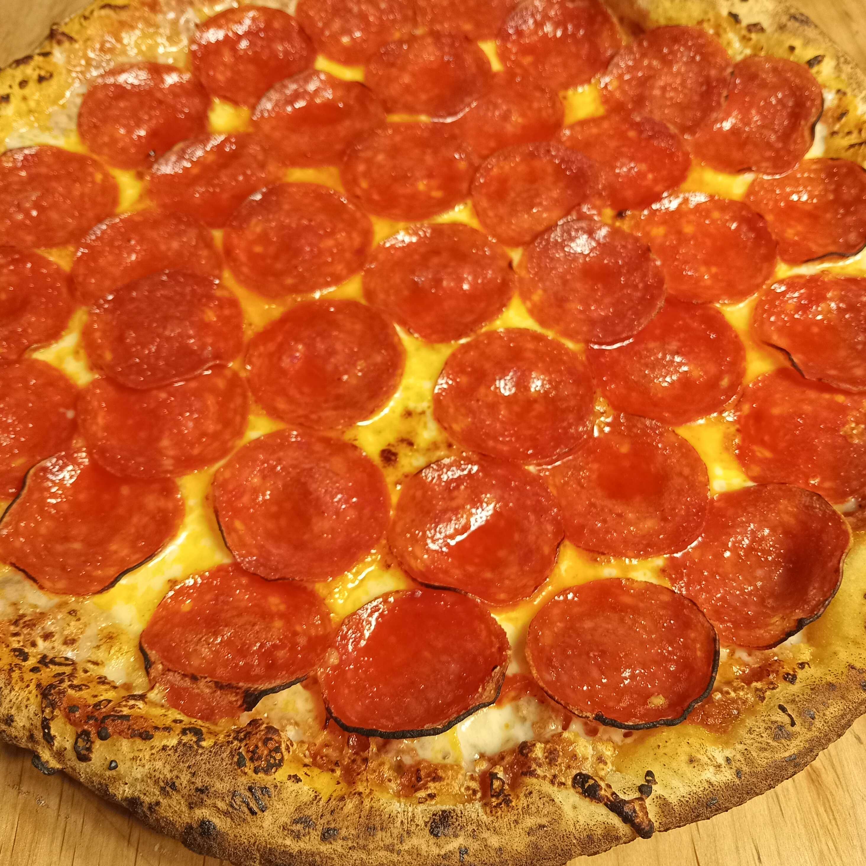 Pepperoni, salsa pomodoro y queso mozzarella. Incluye chimichurri, salsa macha y salsa cátsup, 8 rebanadas 32 cm.
