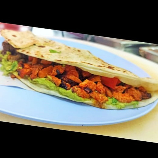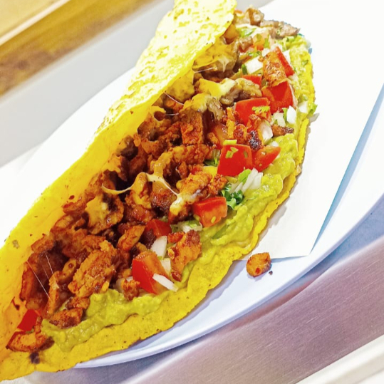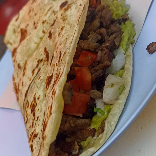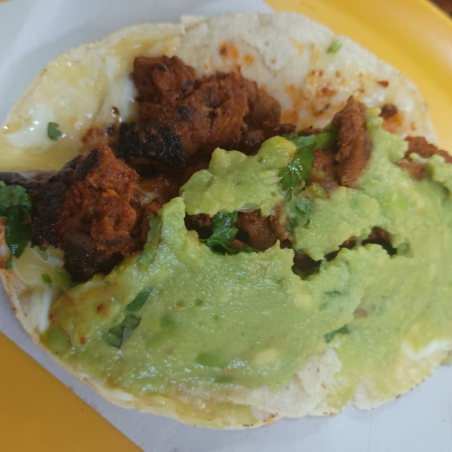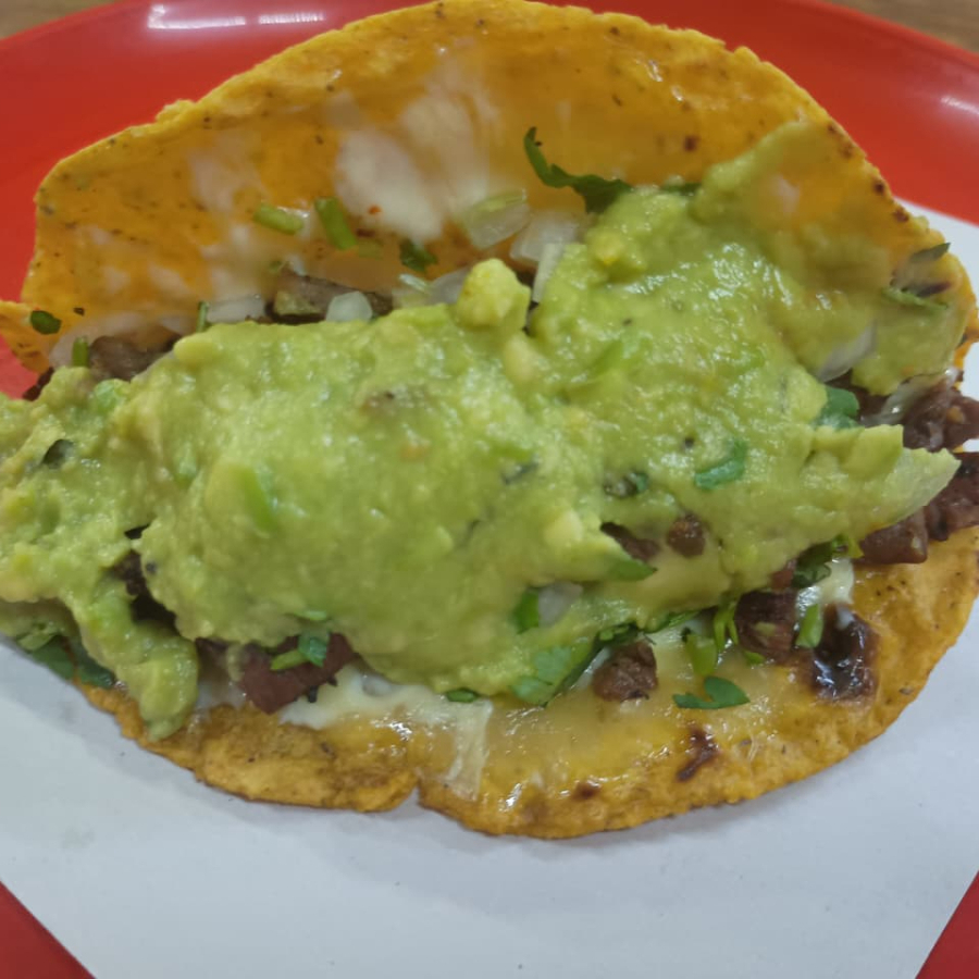 taco con doble tortilla, servido con quesillo y carne adobada, coronado con cebolla, cilantro y guacamole
