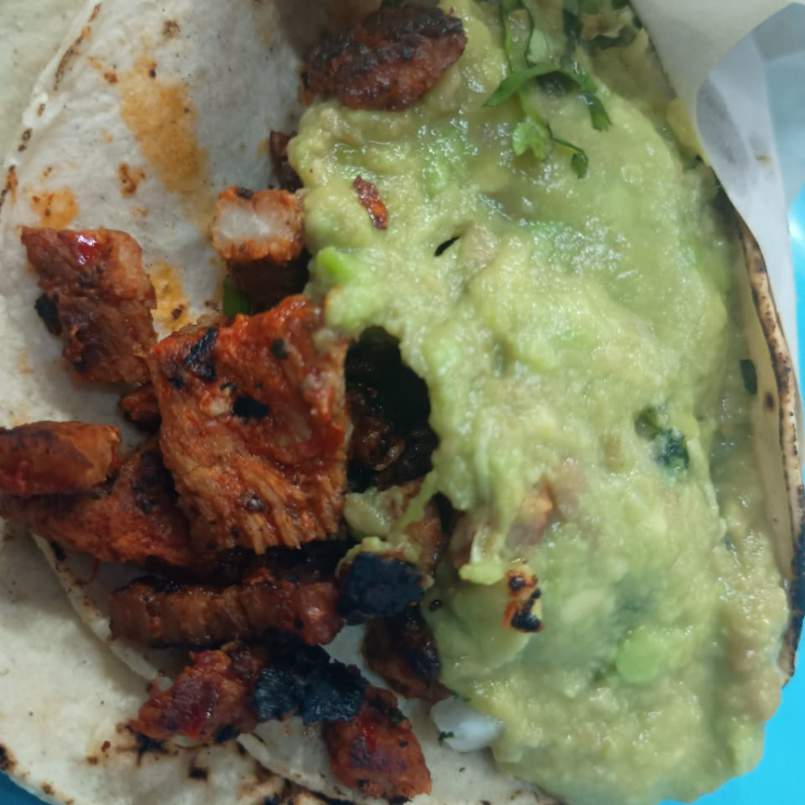 taco con doble tortilla, servido con carne adobada y coronado con cebolla, cilantro y guacamole