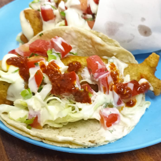 taco preparado con doble tortilla, servido con filete de tilapia capeado y frito, coronado con repollo, pico de gallo y mayonesa