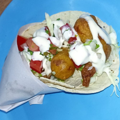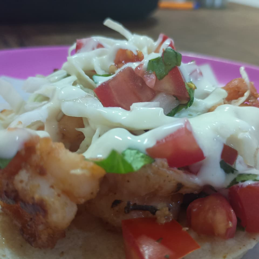 taco preparado con doble tortilla, servido con camarón capeado y frito, coronado con repollo, pico de gallo y mayonesa