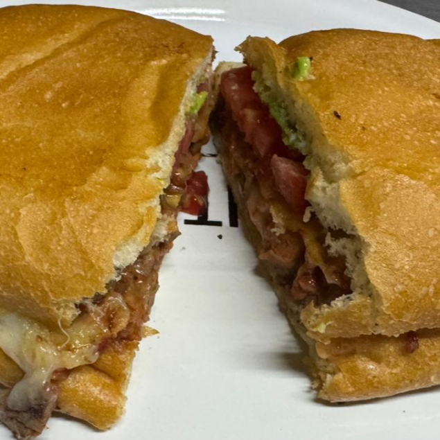 CARNE A ESCOGER, AGUACATE, FRIJOL, MAYONESA, QUESO, TOMATE, CEBOLLA Y LECHUGA.
