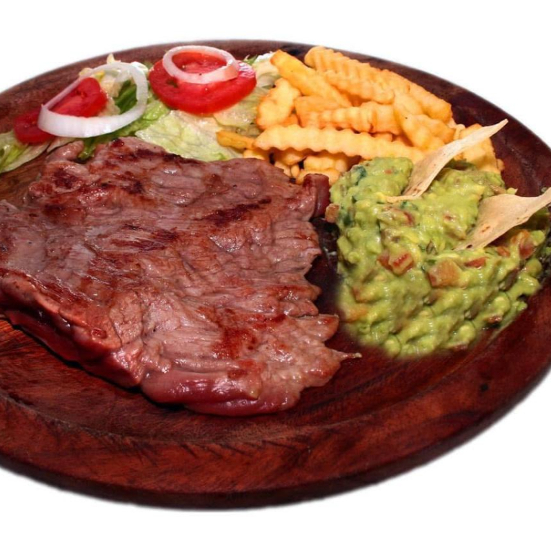 SABROSA CARNE DE RES CON GUACAMOLE, ENSALADA Y PAPAS A LA FRANCESA