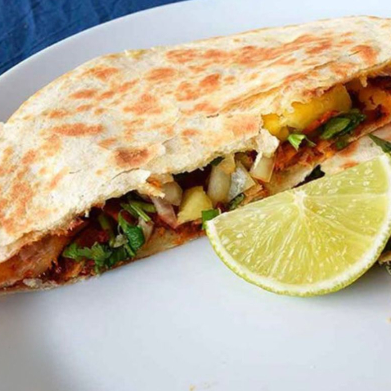tortilla, queso,cebolla, cilantro ( 1 ingrediente a elegir pastor o chorizo o pollo o nopales )