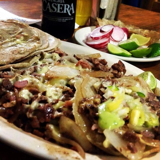 carne al pastor, bistec, chuleta. chorizo, longaniza cubierto de queso gratinado, cebolla azada, aguacate