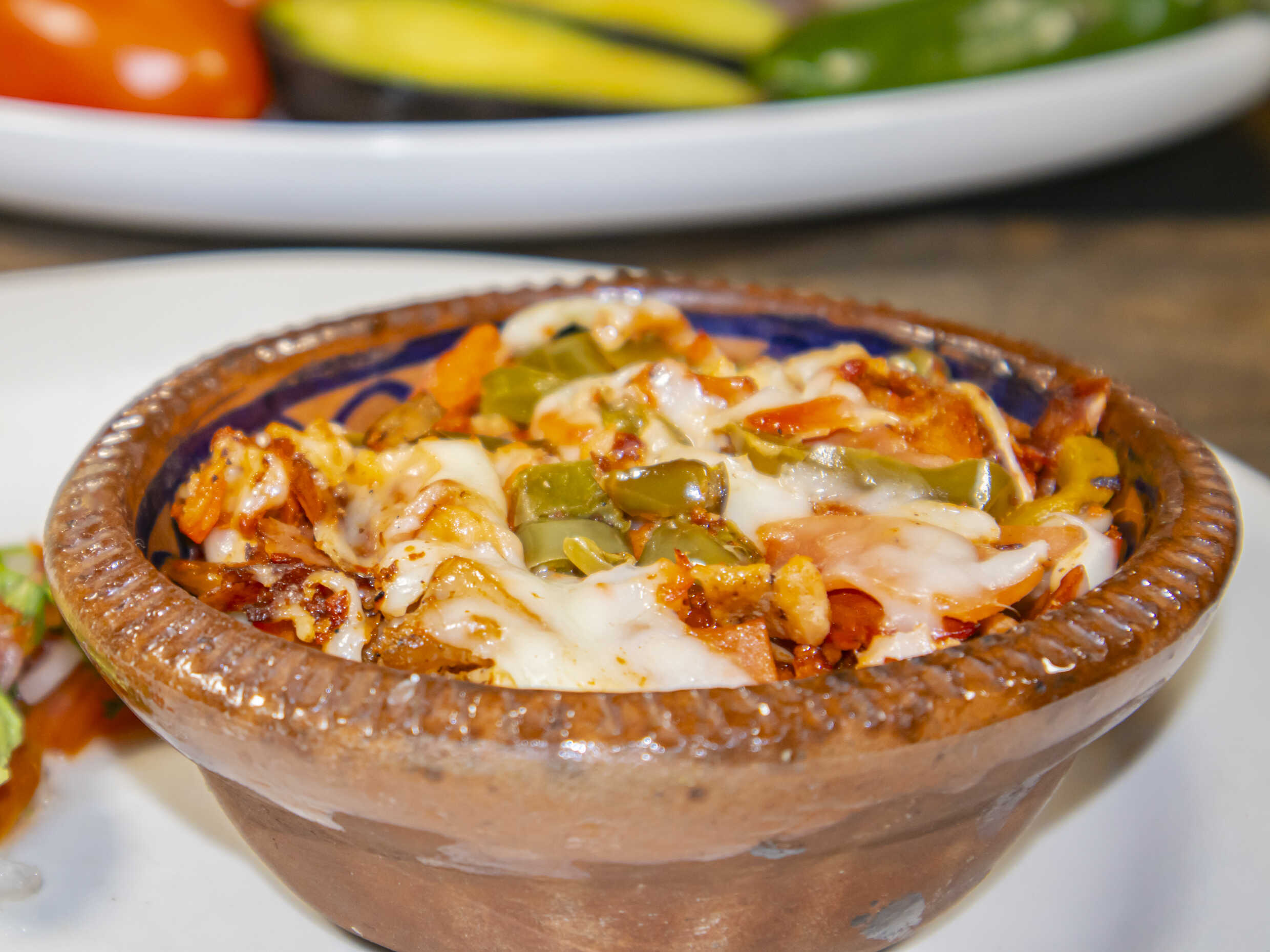 Bistec, nopales, tocino, chile, pico de gallo y queso.