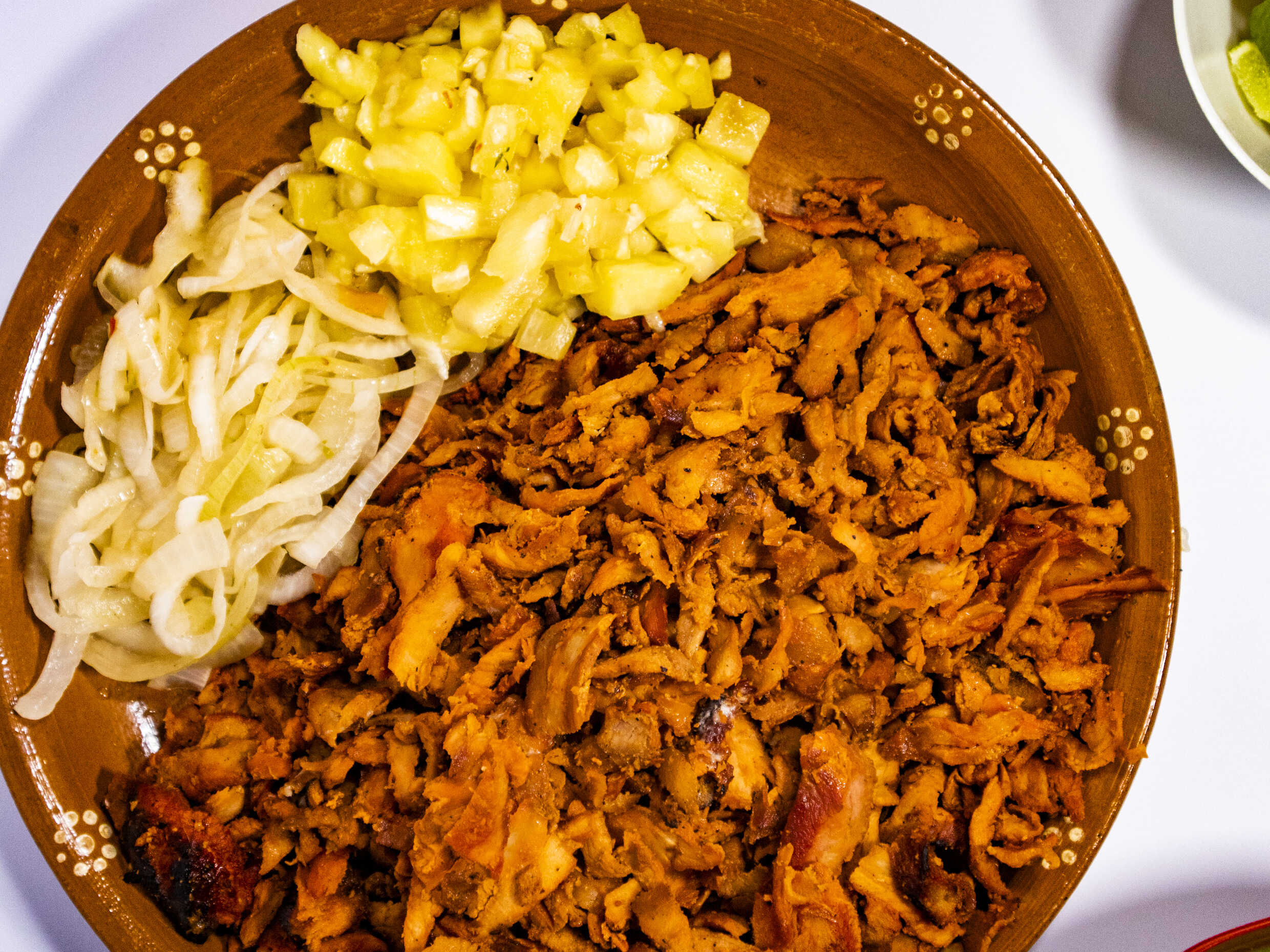 Lleva tortillas de maíz, salsas, piña y cebolla asada