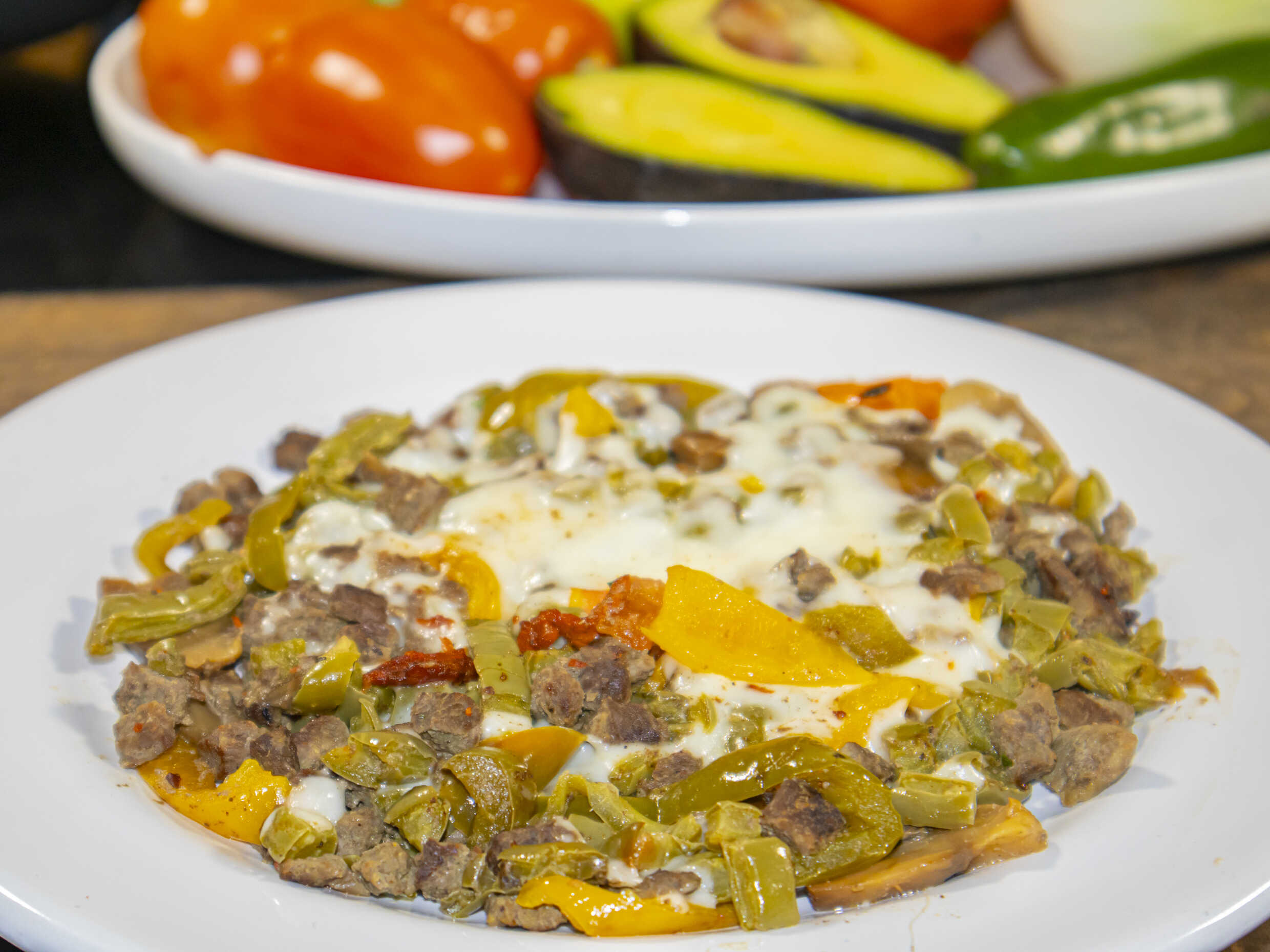 Bistec, nopal, champiñones, pimiento y queso.