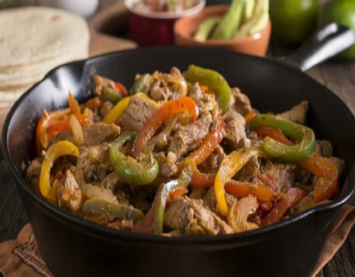 Medio bistec de puerco, pimiento morrón, cebolla, pastor, queso y aguacate.