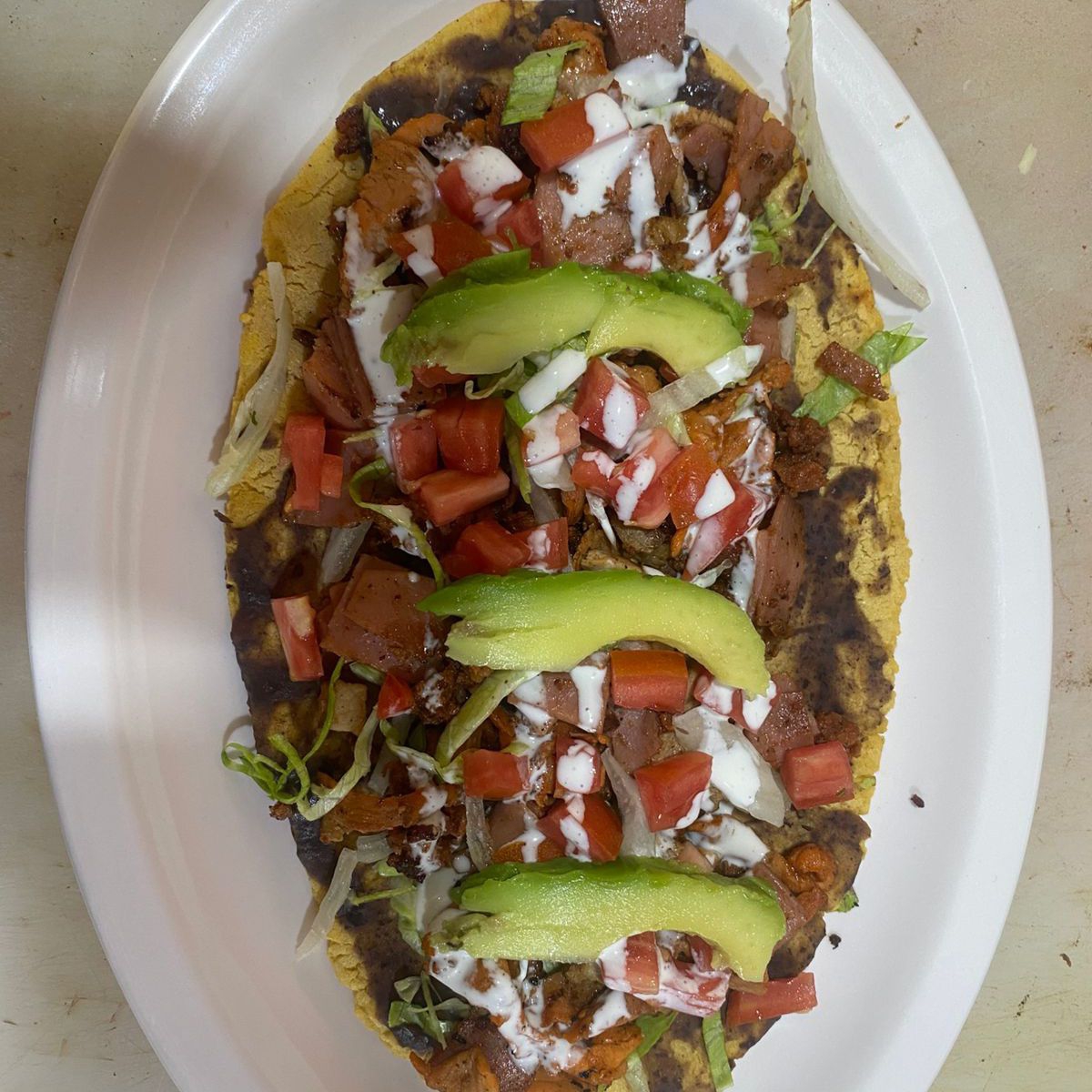 Tortilla de Maiz para Huarache, Frijol, Carne al Pastor, Lechuga, Tomate, Aguacate, Crema, Queso