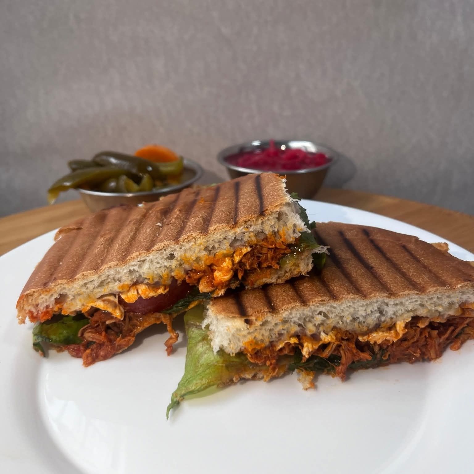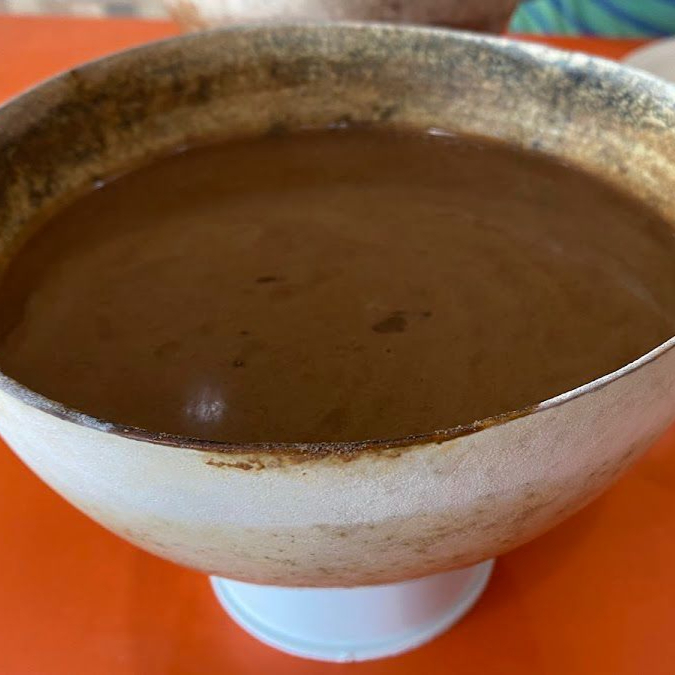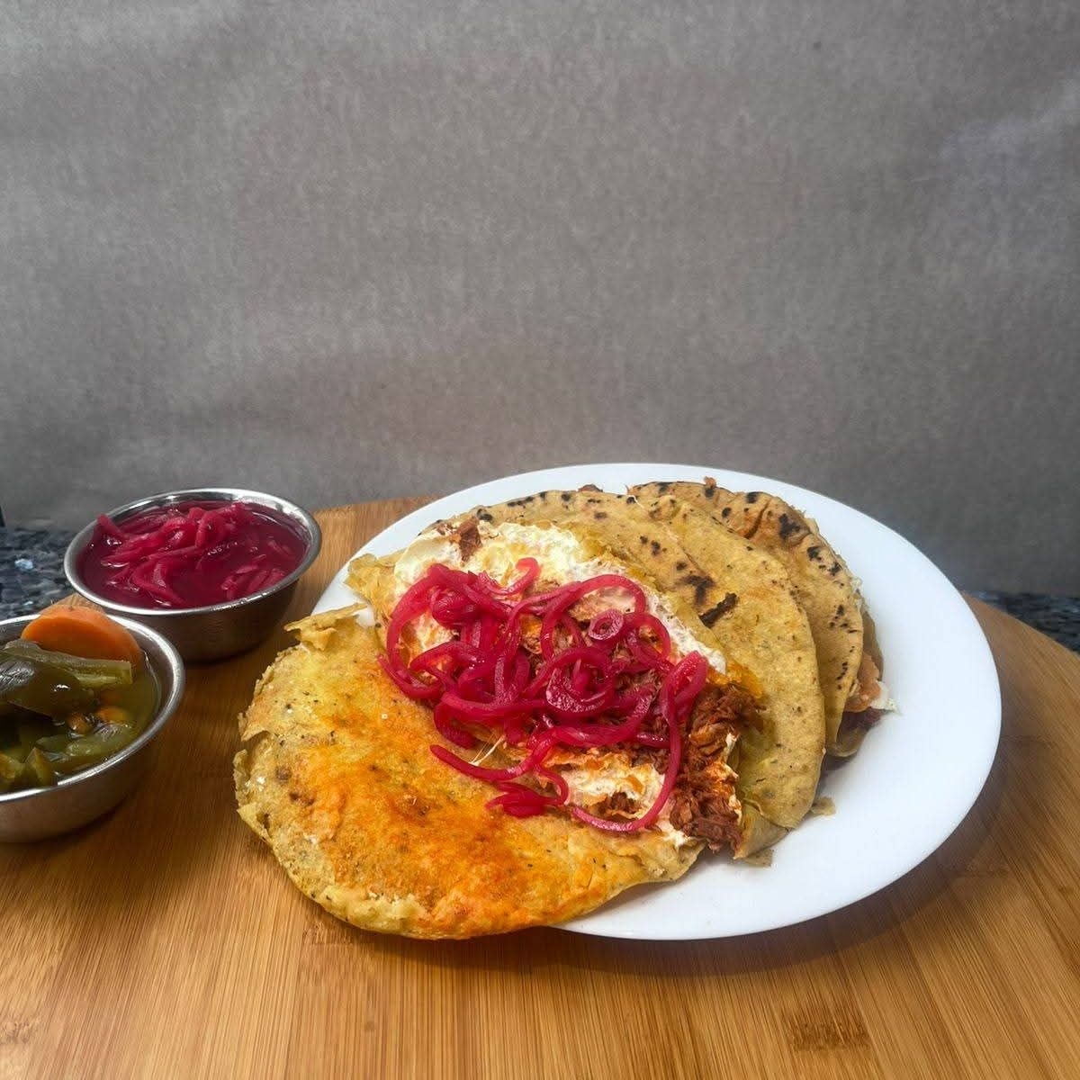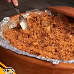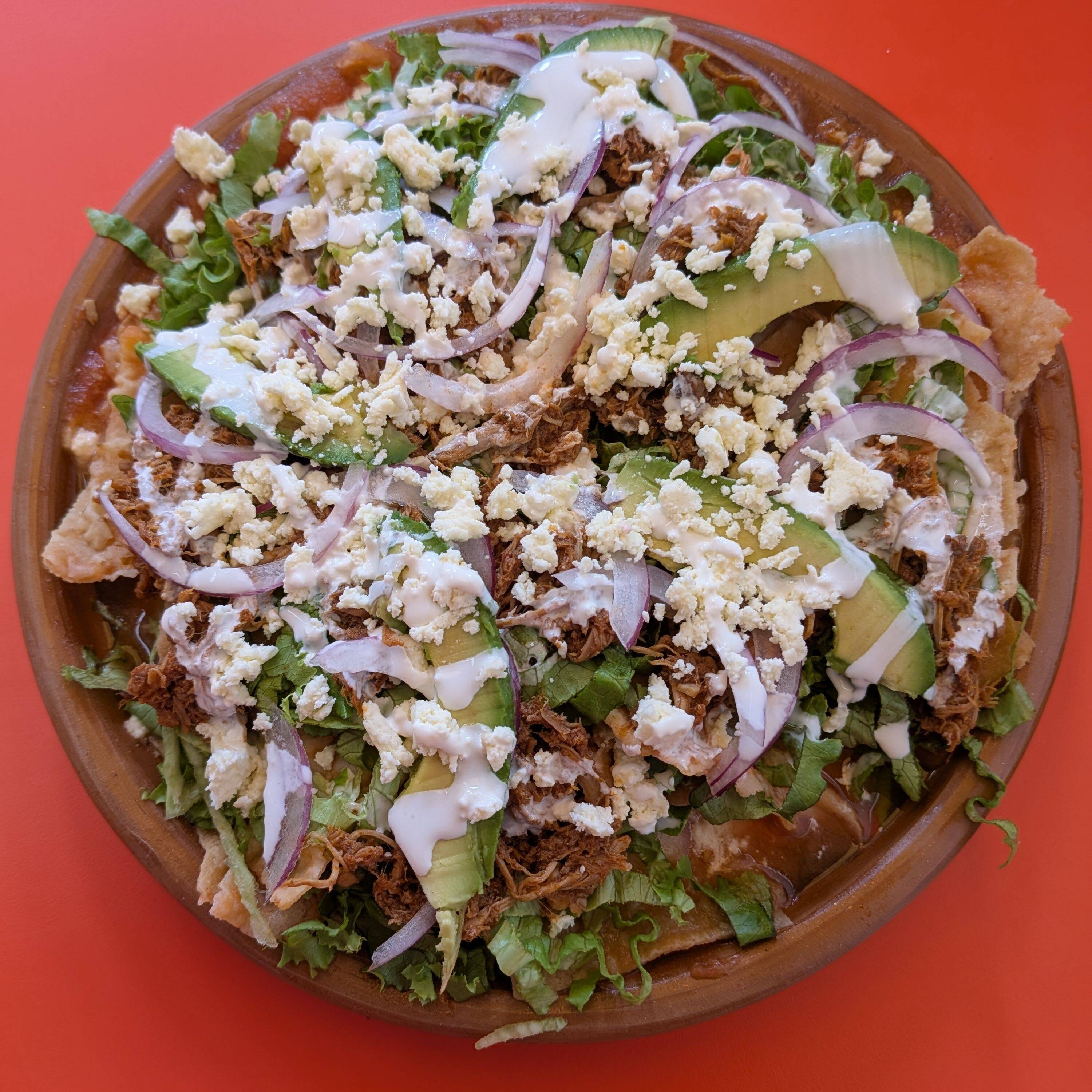 Totopos, carne de cochito, salsa roja, lechuga, queso, crema