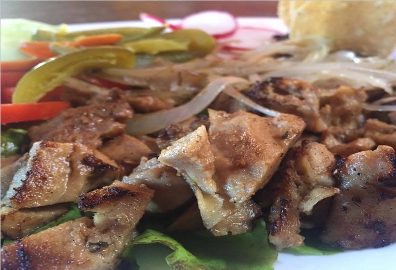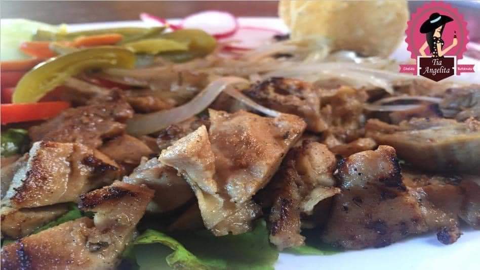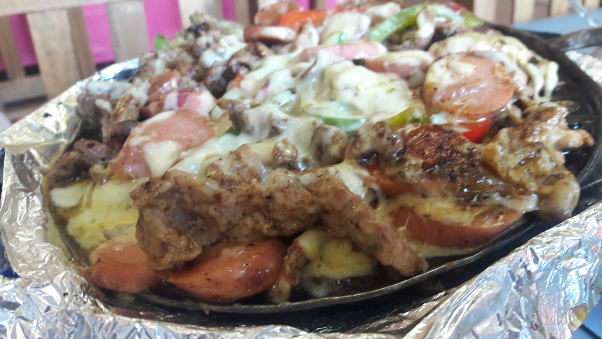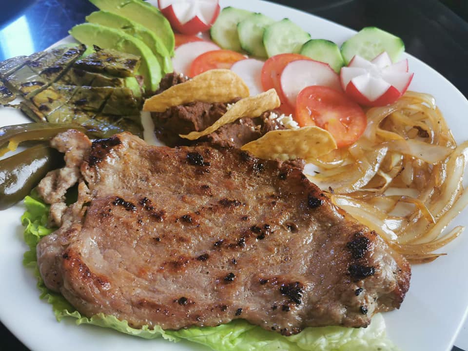 Combinación de carne de puerco, champiñones, pimientos, cebolla y gratinado de queso asadero.
