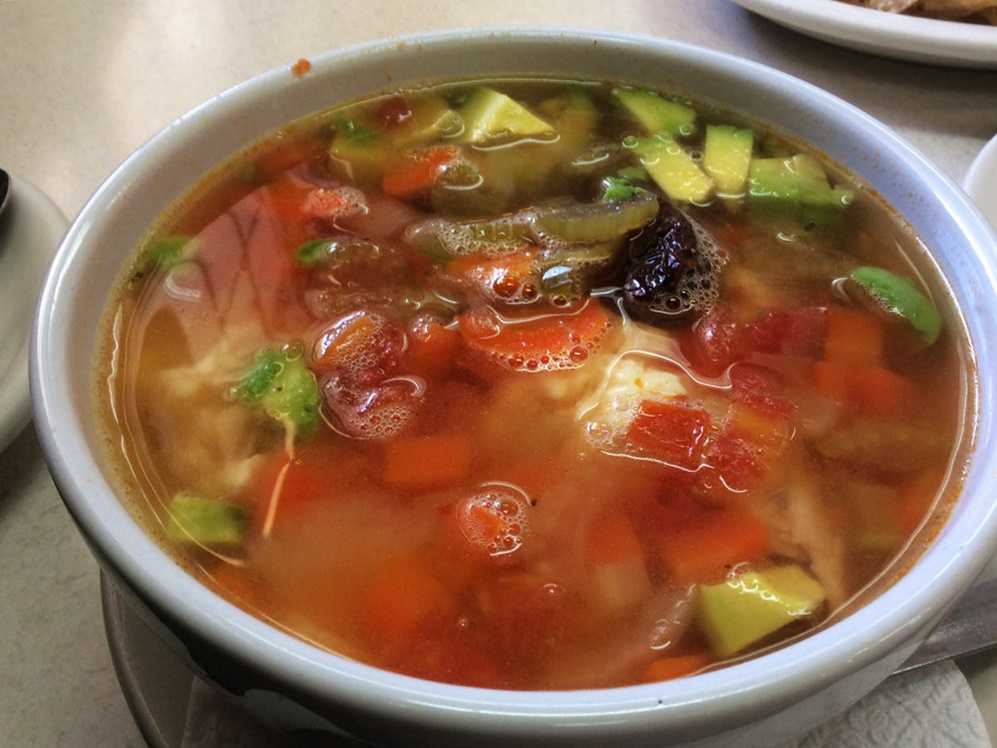 caldo de pollo con verduras, quesillo, aguacate y tostadas