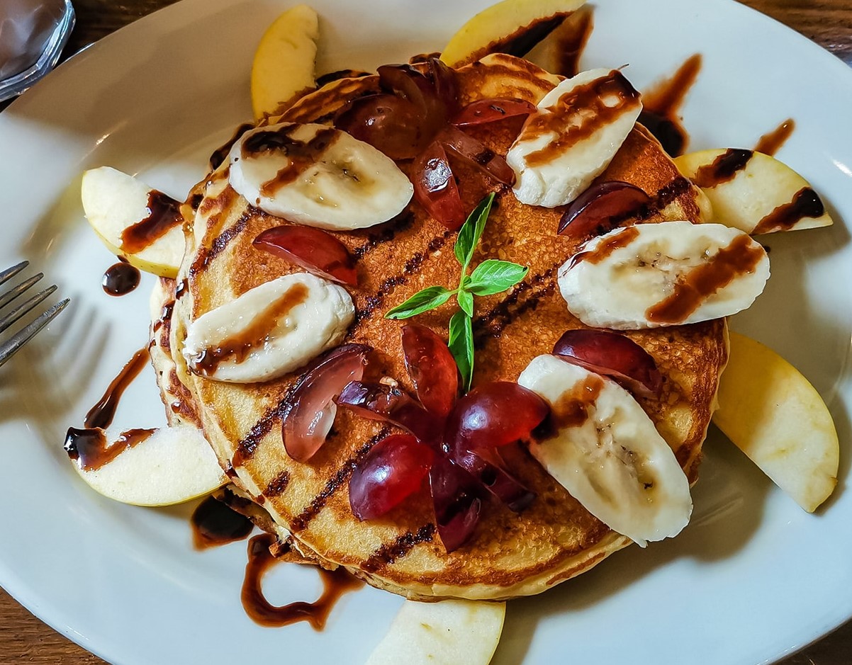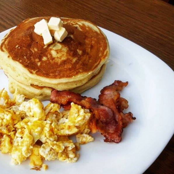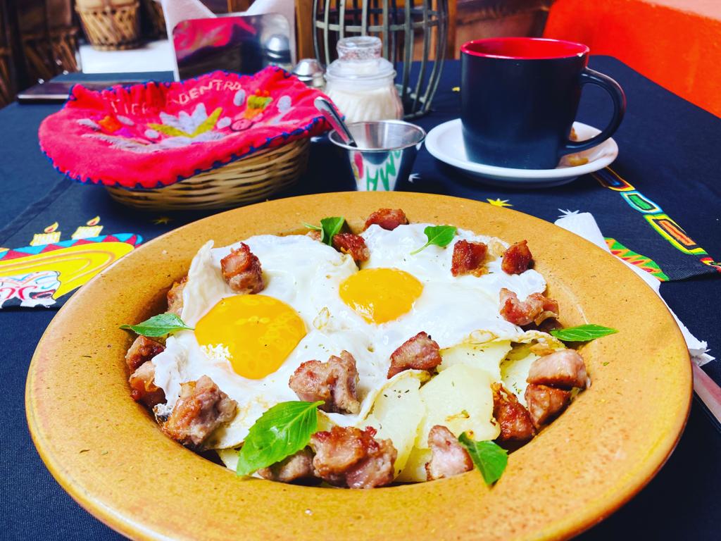 Cebolla, pimiento, tocino, queso y salsa, incluye cAfe o te y jugo o fruta
