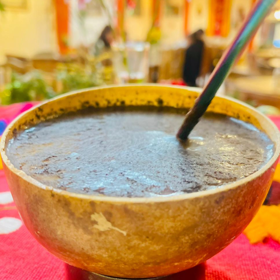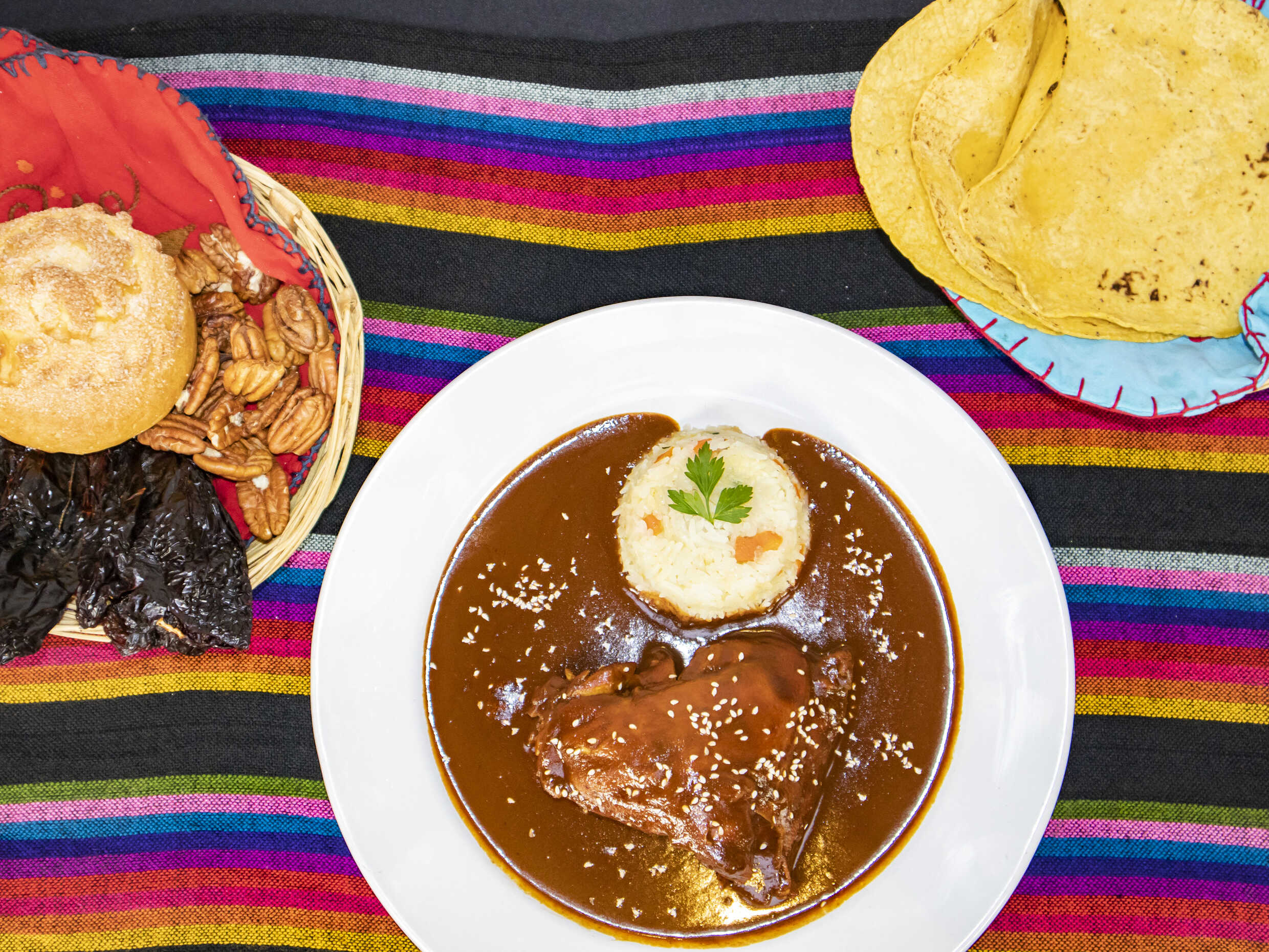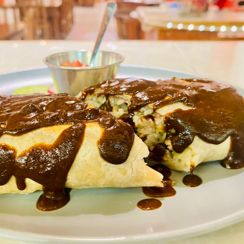 relleno de carne asada,frijoles,queso y arroz bañado en mole