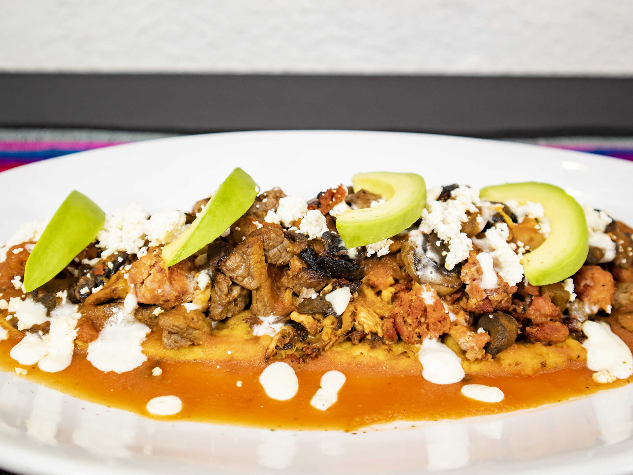 de maíz hecho a mano, acompañados de queso, arrachera , chorizo, nopales, pollo y champiñones.