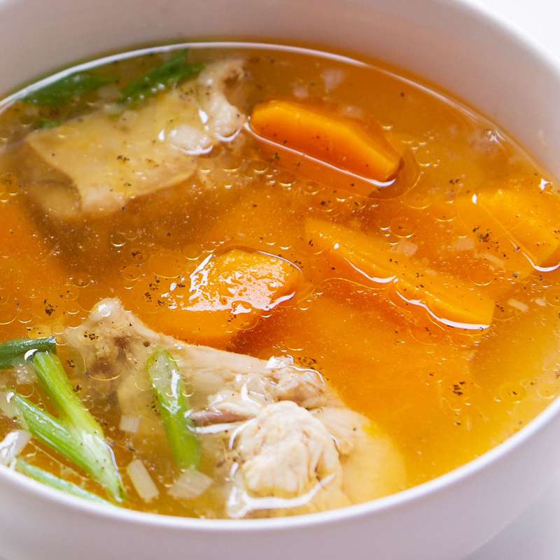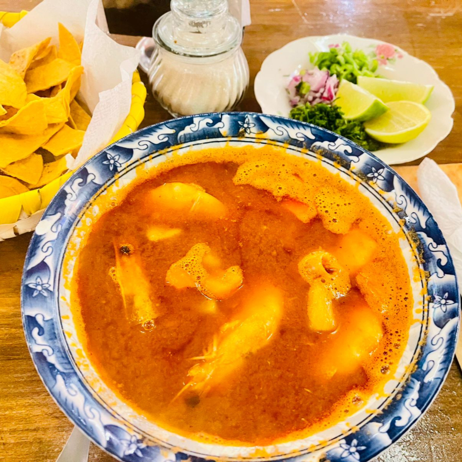 hecho en una base de caldo de pollo con verduras,platanos fritos,pan horneado y huevo duro