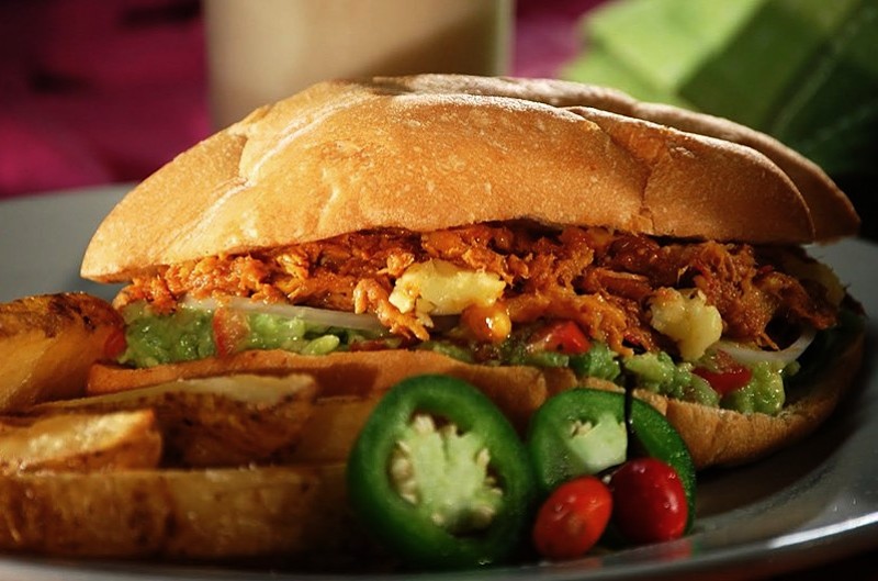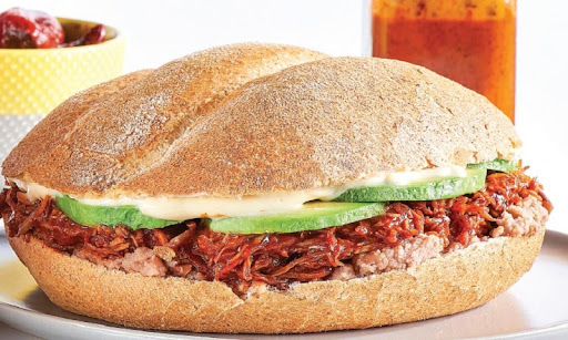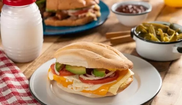 Pierna, jamón y queso manchego, acompañado de papas a la francesa y bebida a eligir puede ser: Jamaica, horchata o coca-cola.